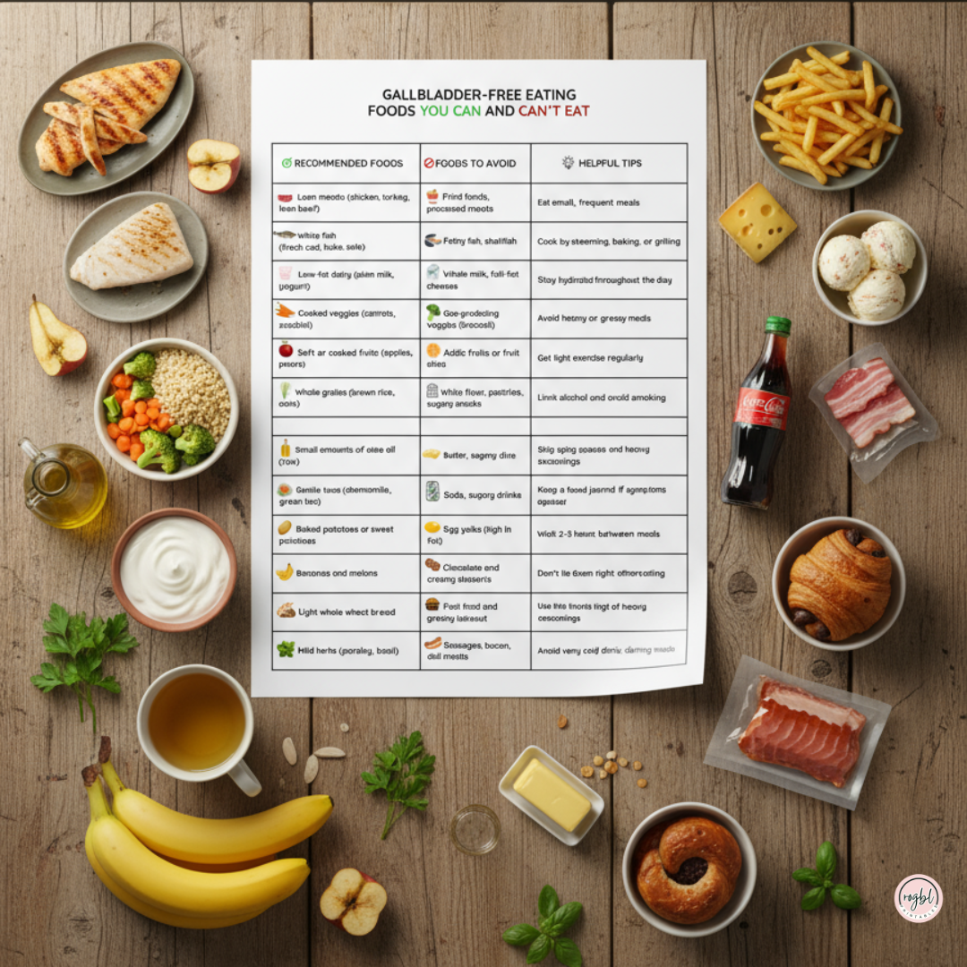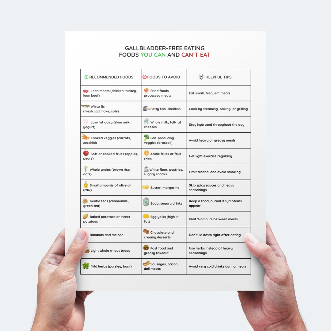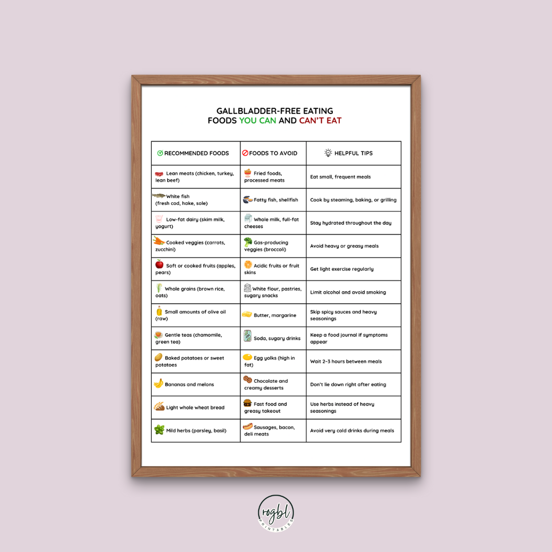 Having this chart at hand helps you plan your meals with confidence and avoid digestive discomfort. Perfect for anyone who needs a healthy, gallbladder-friendly diet guide.