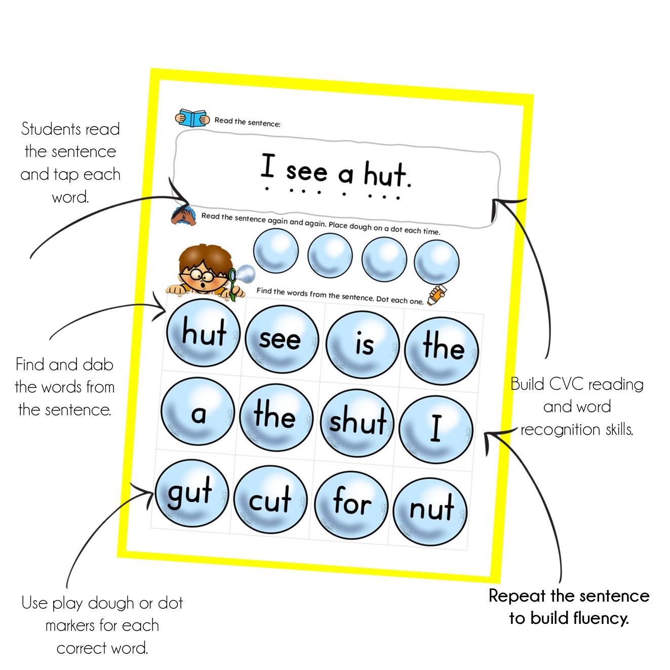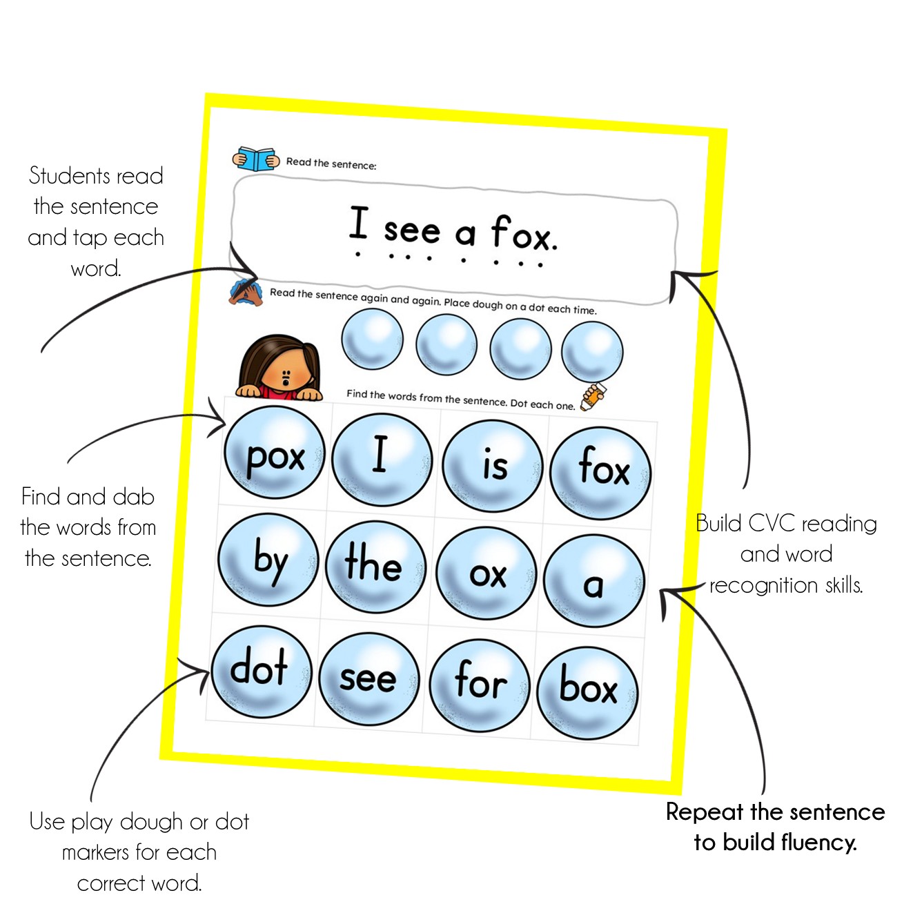 Build reading fluency with engaging activities using play dough, dot markers, and repeated reading routines.