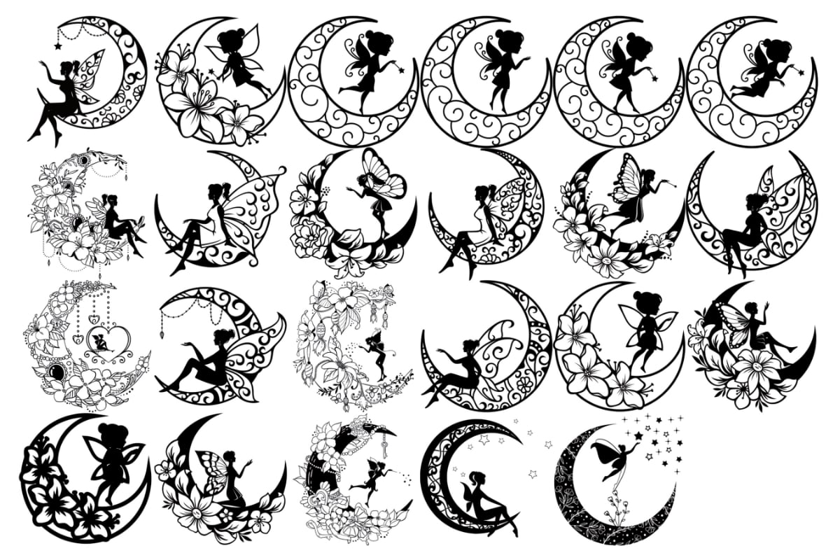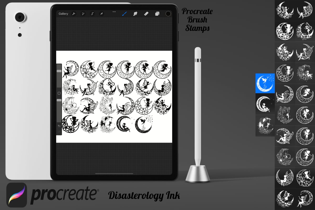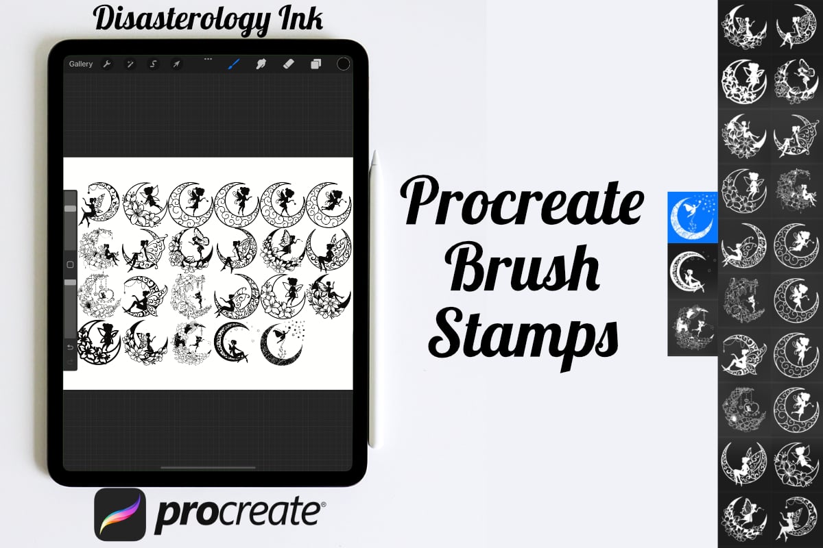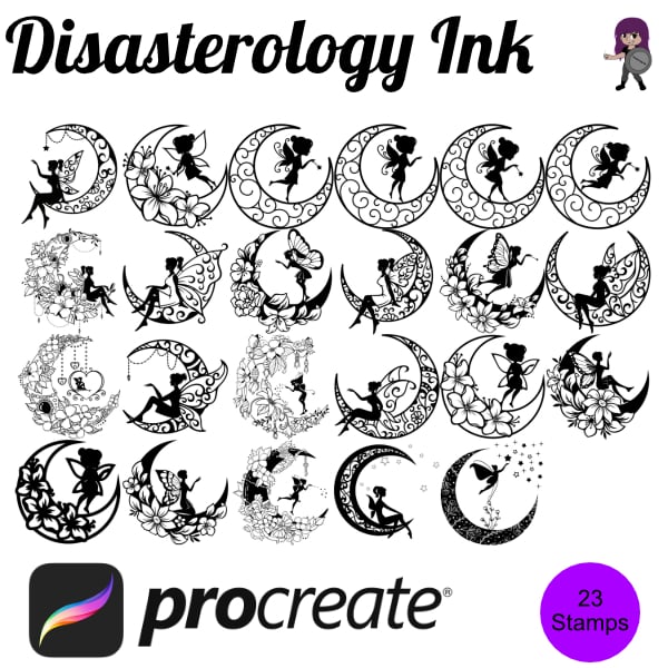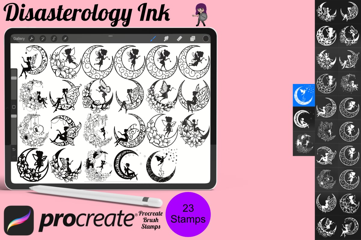 Crescent Moon Fairy Procreate Brush Stamps, 23 Fairy Designs featuring Fairies Moons, Swirls, Patterns and Flowers