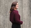 The wearer is 5’10” / 178 cm with a 37” / 92.5 cm chest circumference. The sweater sample has been worked in size 4, giving the wearer 8” / 20 cm of positive ease at the chest; the cardigan sample has been worked in size 5, giving the wearer 10.5” / 26.5 cm of positive ease at the chest. To accommodate the height of the wearer, in both samples an extra 2” / 5 cm of length has been added to the sleeve length and the option to increase neckband depth has been worked for both. In the sweater sample, an extra 2” / 5 cm of length has been added to the body.