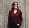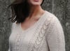 This garment is worked top-down. Stitches are cast on for the back of neck and short row shaping is used to create a curved back of neckhole. Three panels of textured stitches are established along the back piece. Stitches are picked up to create two front pieces, with short row shaping used to slope the shoulder. A panel of textured stitches is established down each front piece. Increases are worked to create and shape the sleeves and a V neckhole. For most sizes, increases are also worked to shape the armscye at front and back. For the sweater version, when the V neckhole is close to completion, another panel of textured stitches is established at the centre front, then the V-Neck is joined and the garment then continues in the round. For the cardigan version, the V neckhole is worked in stockinette and once all increases have been worked the garment continues to be worked flat. Once the body is complete, sleeves are each worked in the round and stitches are picked up around the neckhole to work a neckband (for the sweater) or buttonband (for the cardigan).