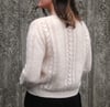 The sample has been worked using Stylecraft’s Grace Aran weight base (85% Premium Acrylic / 10% Mohair / 5% Wool; 295 m / 322 yds per 100 g) in colourways Oyster for the sweater and Black Cherry for the cardigan.