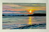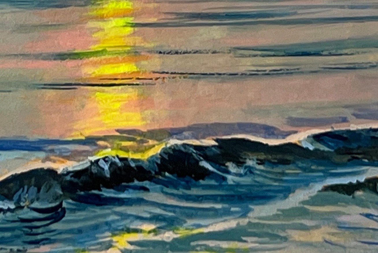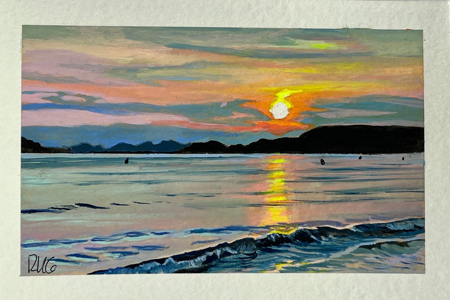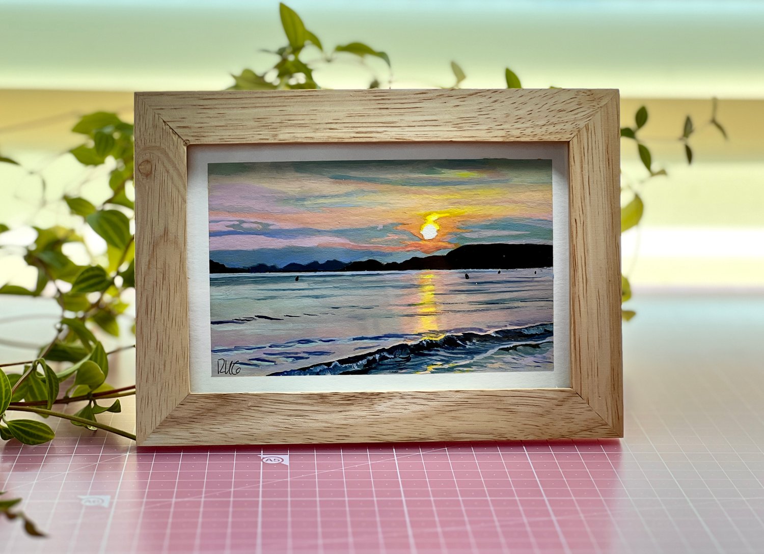 Dramatic 4×6 inch gouache painting of a blazing summer sunset at Mongsanpo Beach in Taean County, South Korea. As I strolled slowly in bare feet on the smooth sand, I was struck by how hot the seawater was. Bathers had to swim a bit of a ways from the shore to cool themselves down. The stark contrast between the gray clouds in the sky that gave no reprieve from the heat and unforgivingly hot yellows and orange tones compelled me to complete this piece.