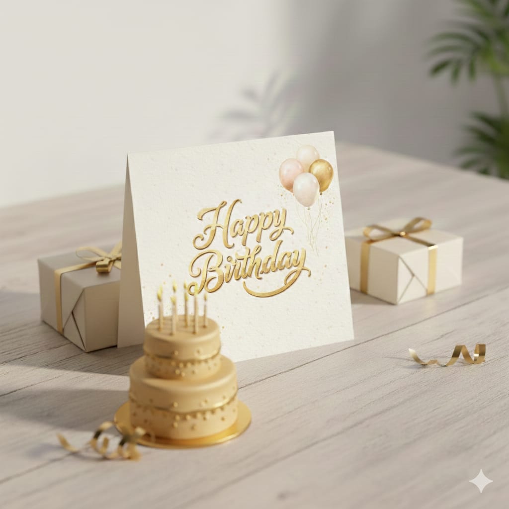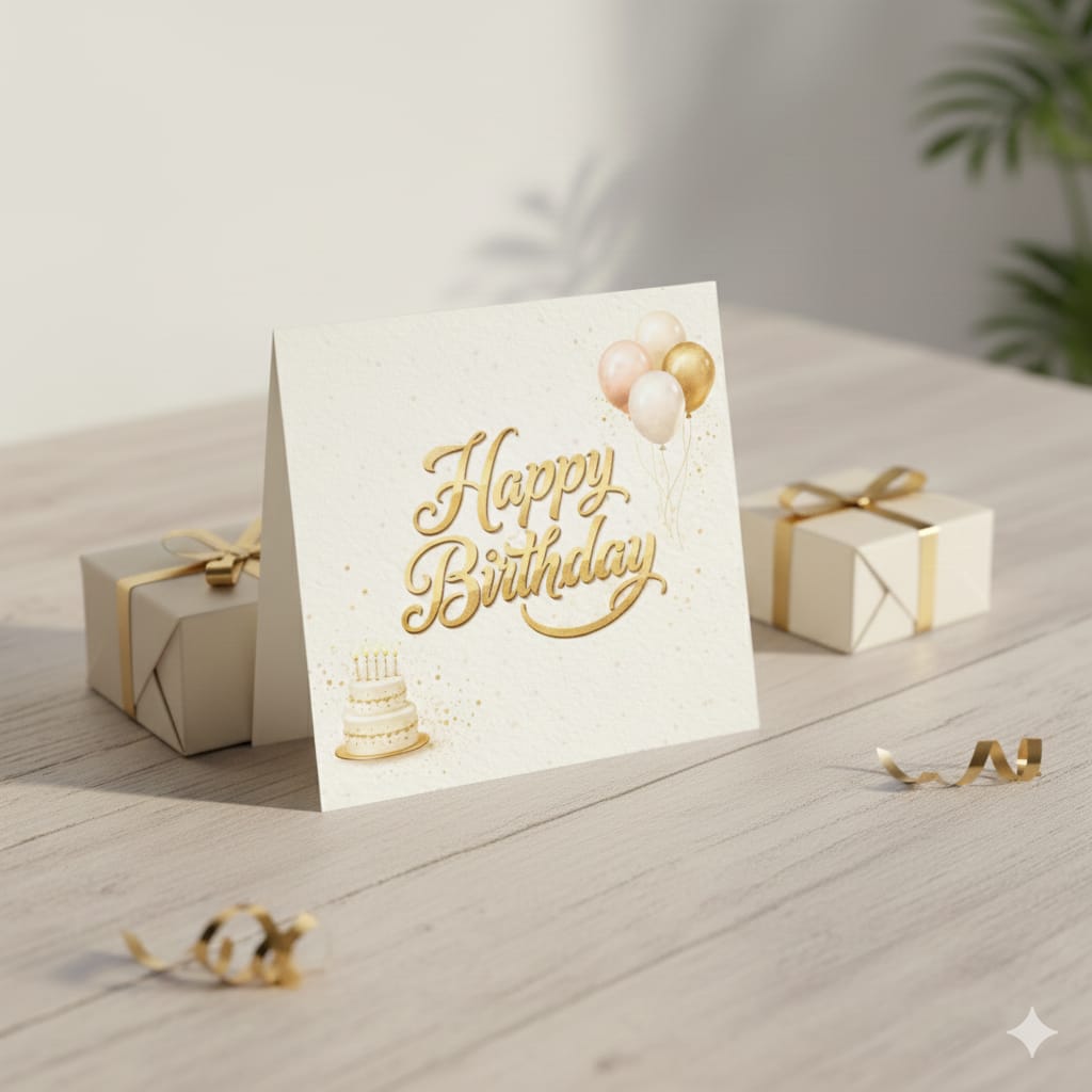 Celebrate birthdays in a timeless and elegant way with this luxury gold “Happy Birthday” card design. Featuring premium golden lettering, soft neutral tones, balloons, and a classic cake illustration, this card is perfect for all ages and occasions.