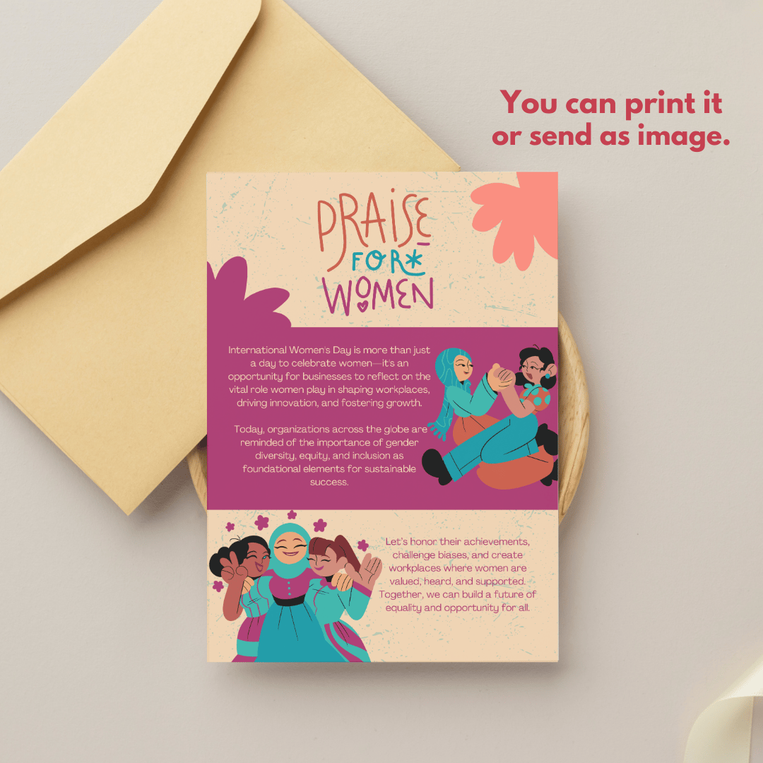 The template emphasizes the importance of gender equality, leadership, and the fight for women's rights, while fostering a sense of unity and celebration. Whether you're designing for professional workplaces, school projects, or personal initiatives, this printable card or flyer brings attention to the vital contributions of women everywhere.
