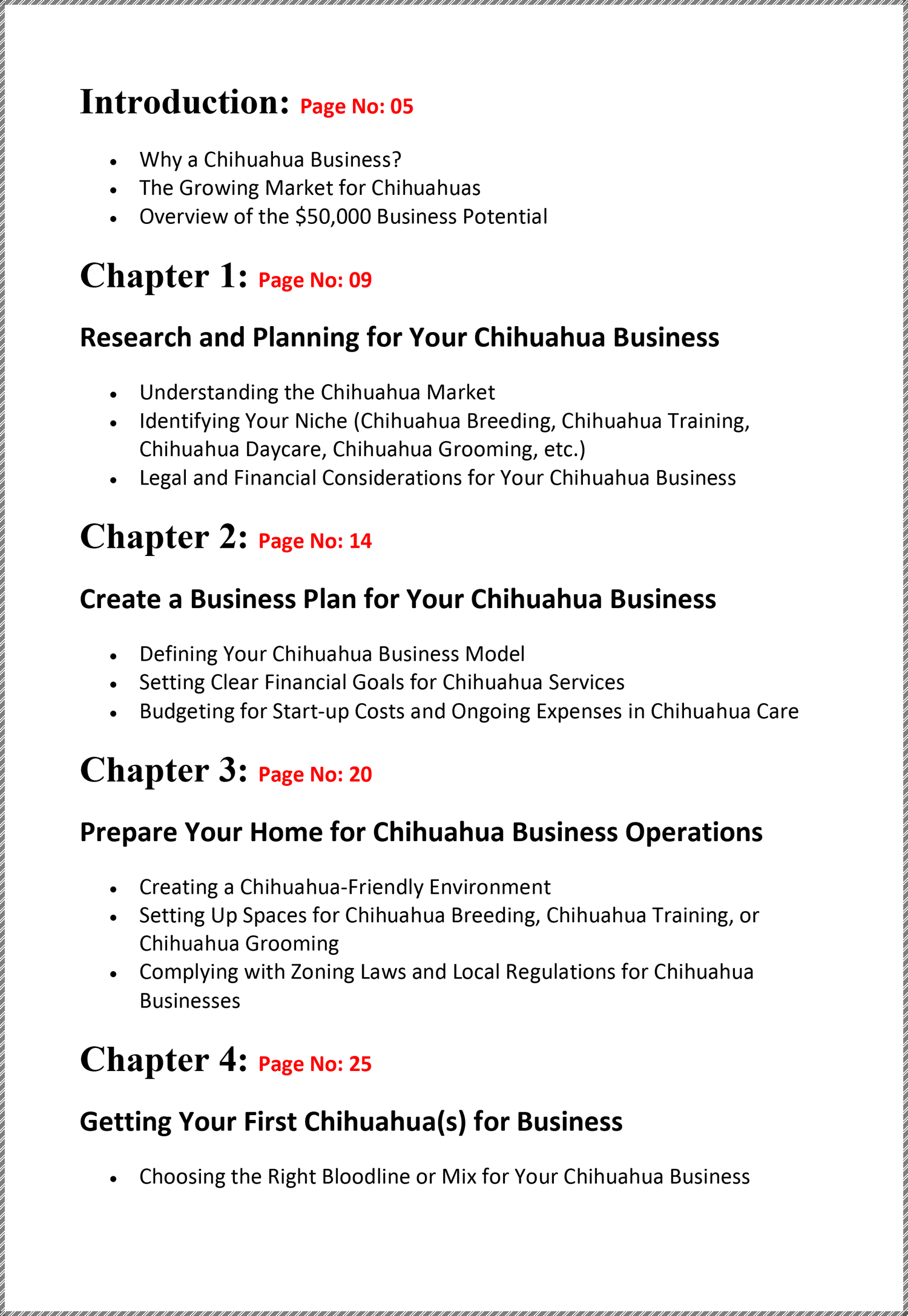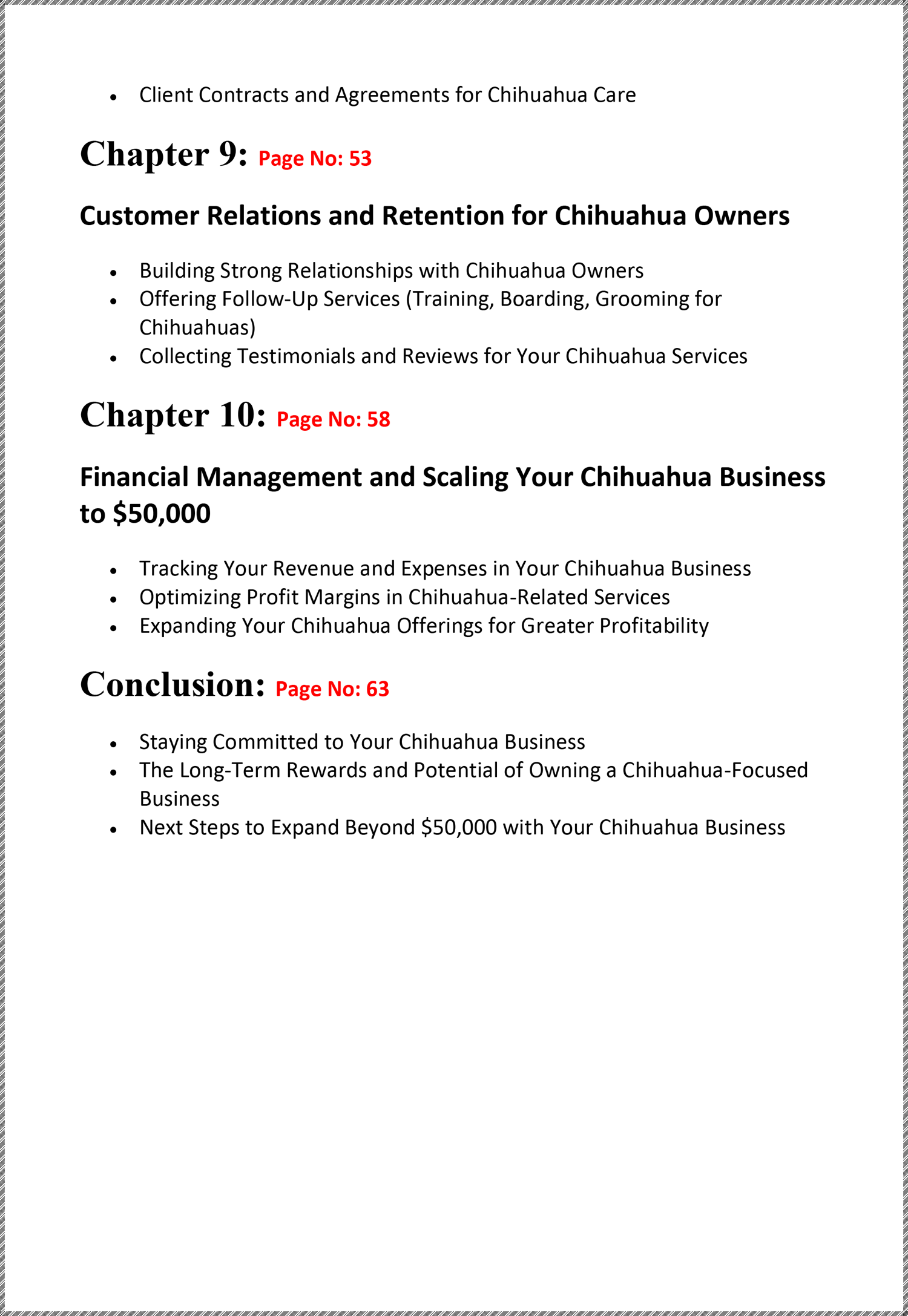 This expert guide gives you 12 chapters and 66 pages packed with expert advice, offering a step-by-step plan to build a $50,000 Chihuahua business from home. From selecting the right Chihuahuas to mastering training, grooming, and marketing, this book provides all the essentials to help you grow your business and achieve long-term success.