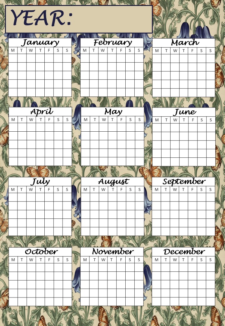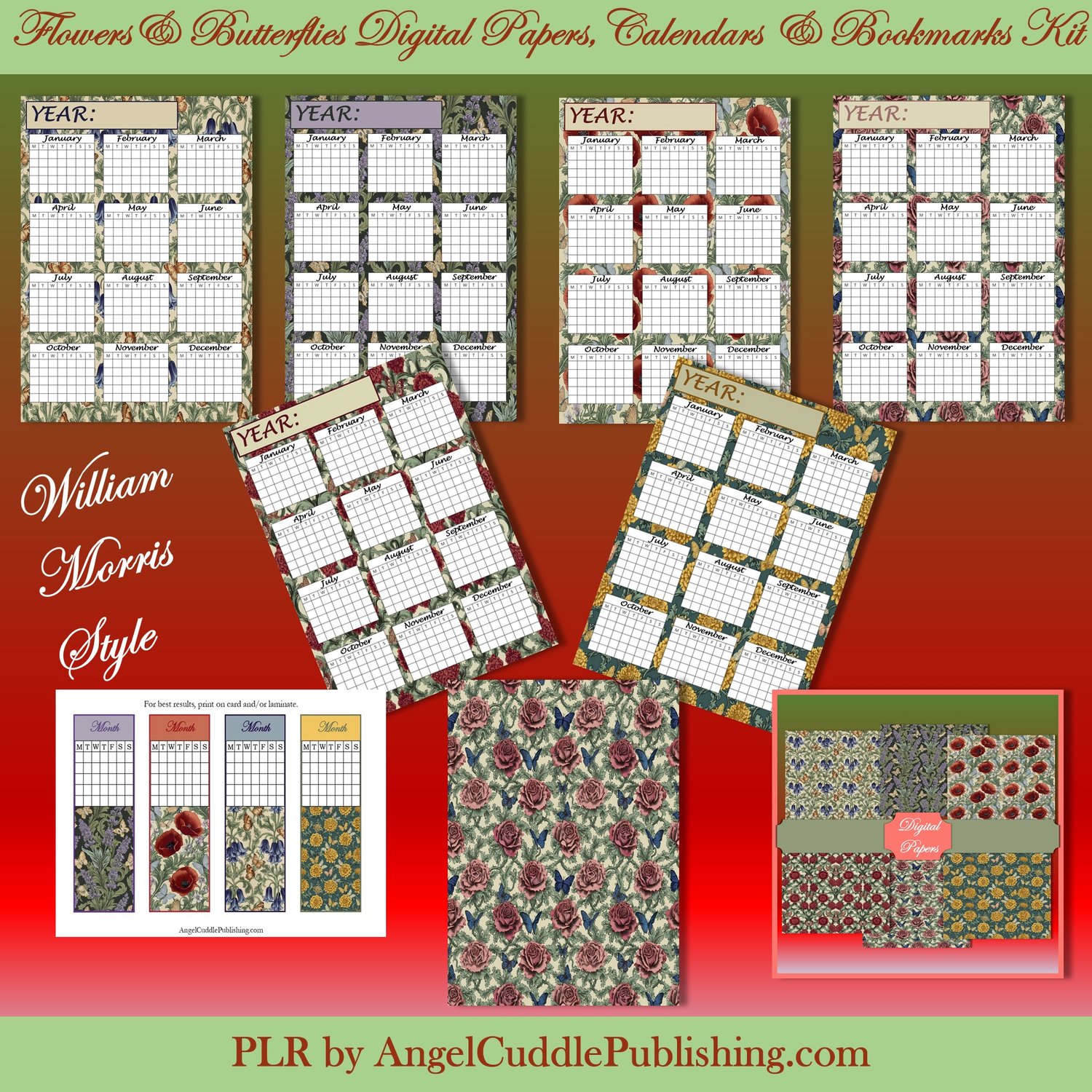 William Morris Style Flowers & Butterflies Digital Papers, Calendars & Bookmarks Kit PLR