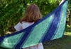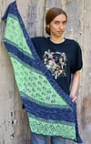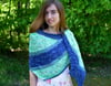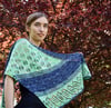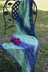 This asymmetric crescent is knit sideways using two contrasting colors in a series of alternating lace and texture patterns connected by slipped stitch stripes. The shawl is finished with a knitted-on edging. You will never get bored with this project. The pattern is suitable for the adventurous knitter to intermediate knitter. Skills required: basic stitches, simple lace, two-color stripes, knitted-on edging.