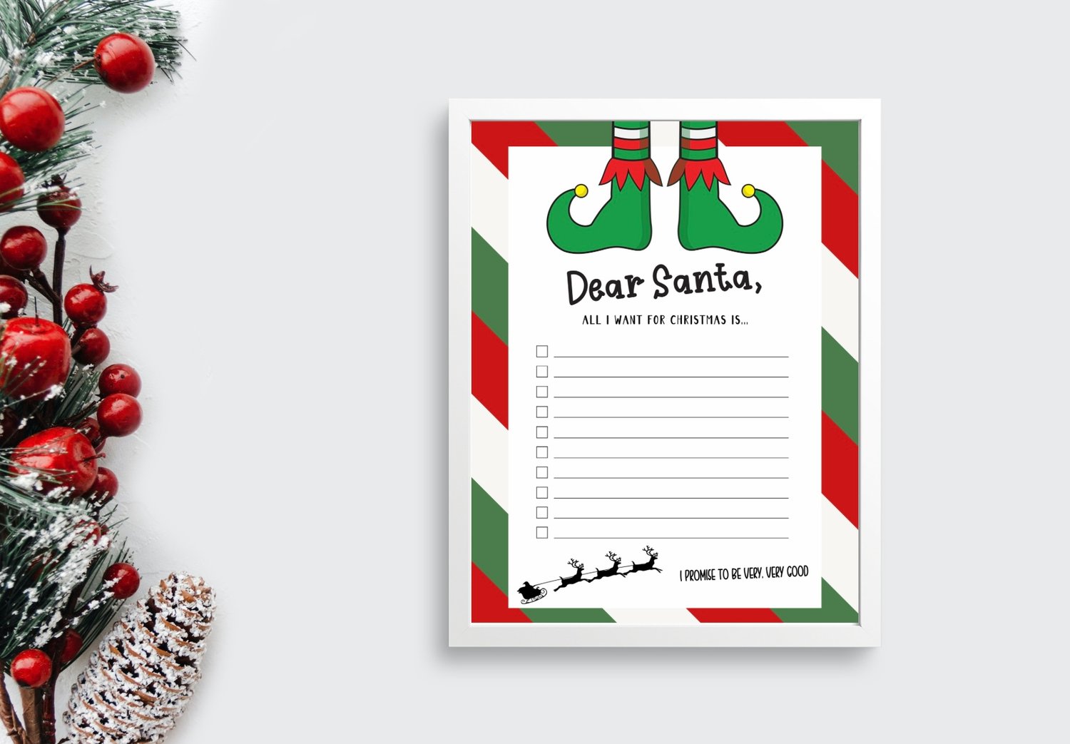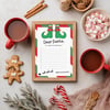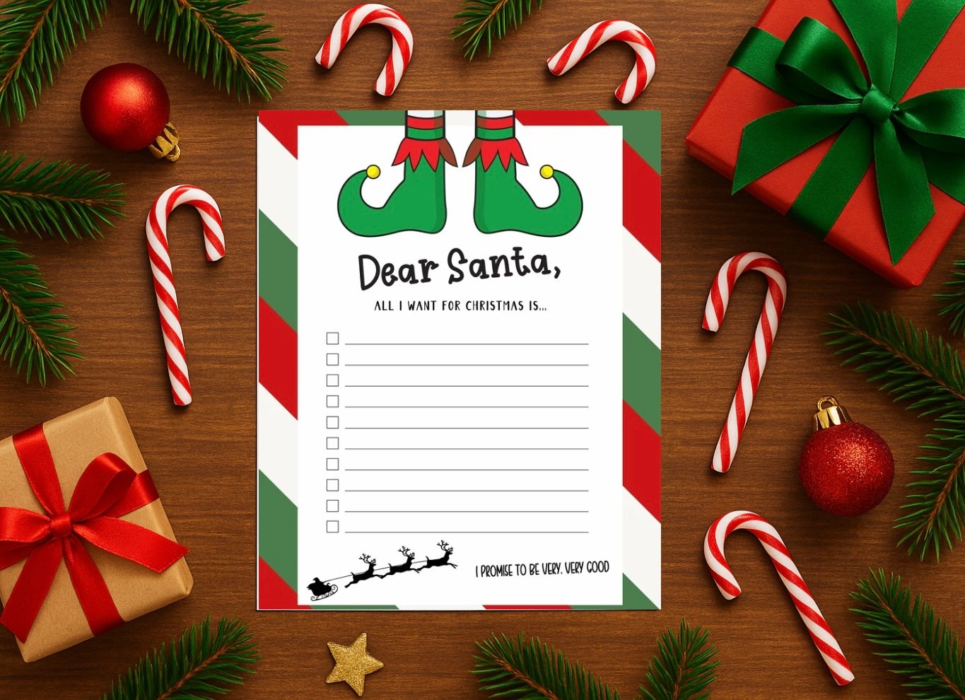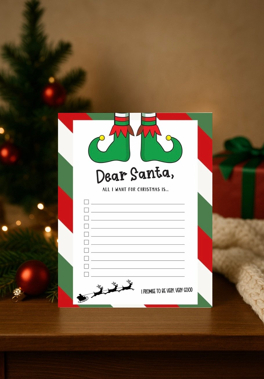 Perfect for kids to write down their Christmas wishes and leave out with cookies on Christmas Eve. This printable letter-size worksheet features festive elf shoes and a checklist layout, making it fun and easy for children to fill in.