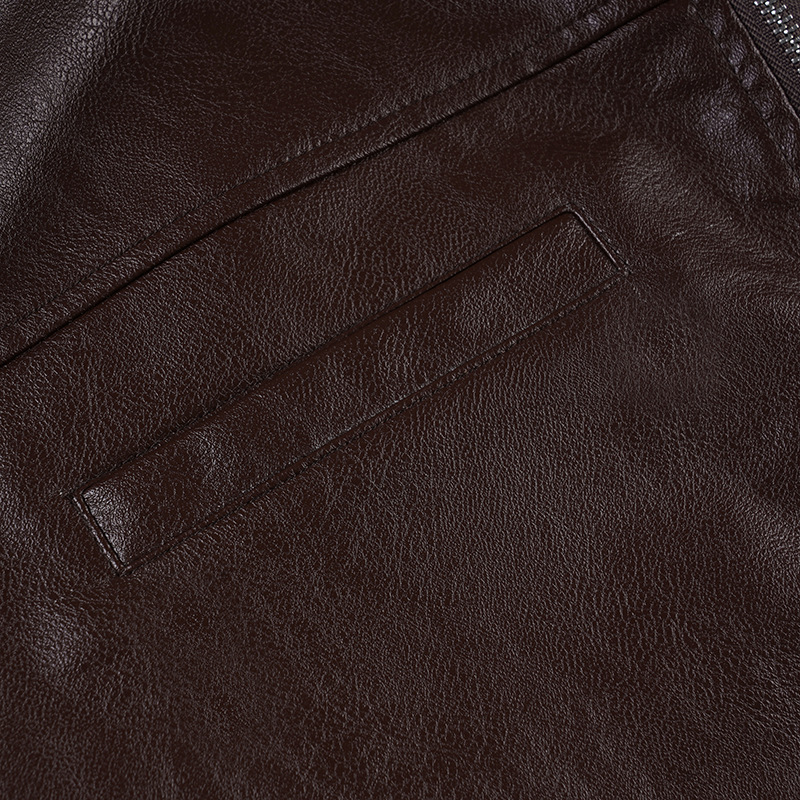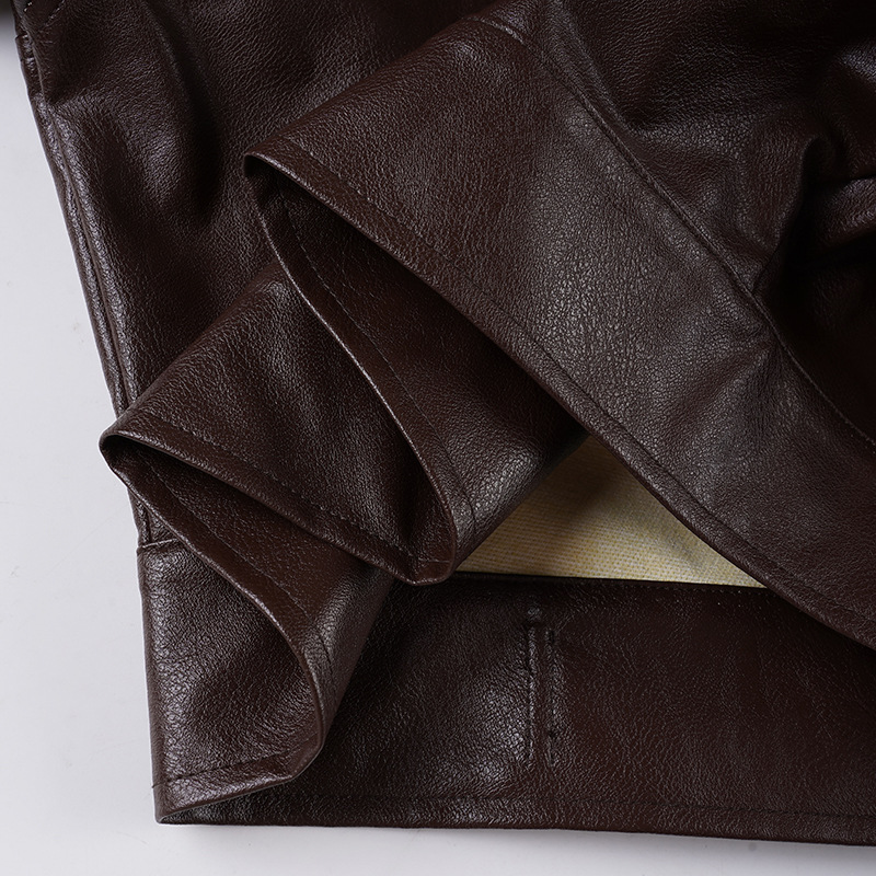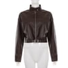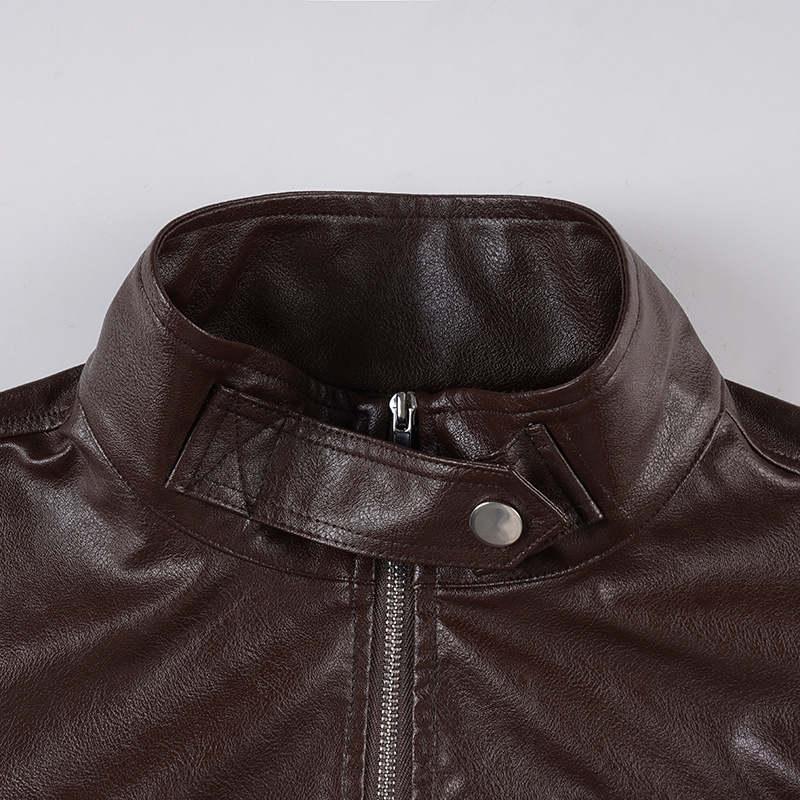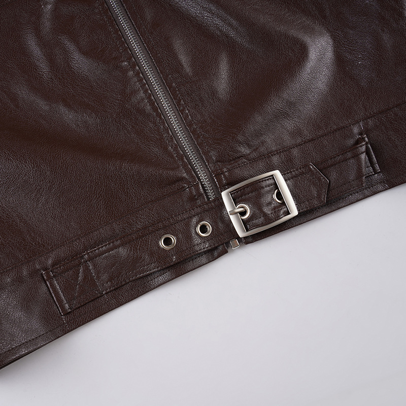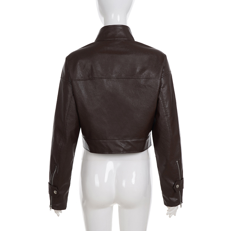 Retro brown stand collar loose cardigan metal buttons short leather jacket