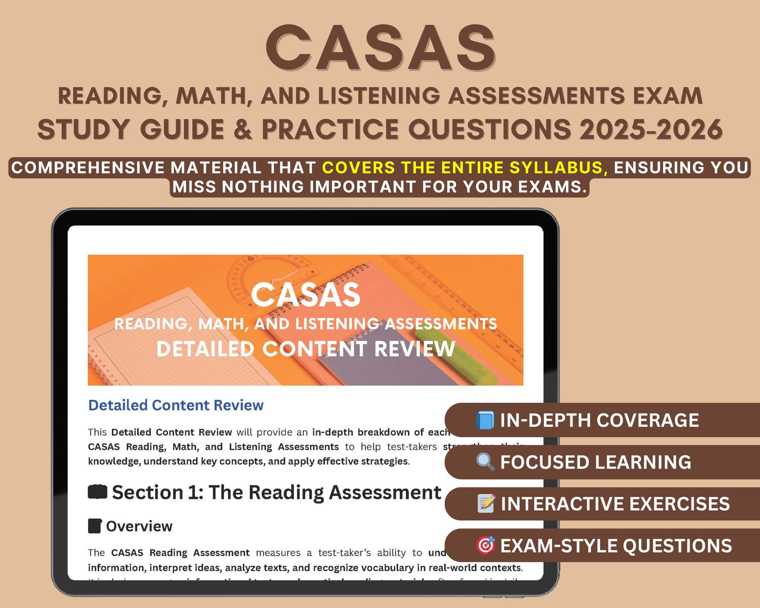Are you preparing for the CASAS Reading, Math, and Listening Assessments? This comprehensive, easy-to-follow digital study guide is designed to help adult learners, ESL students, job seekers, and workforce training participants master essential skills and achieve a high score on the CASAS exam.