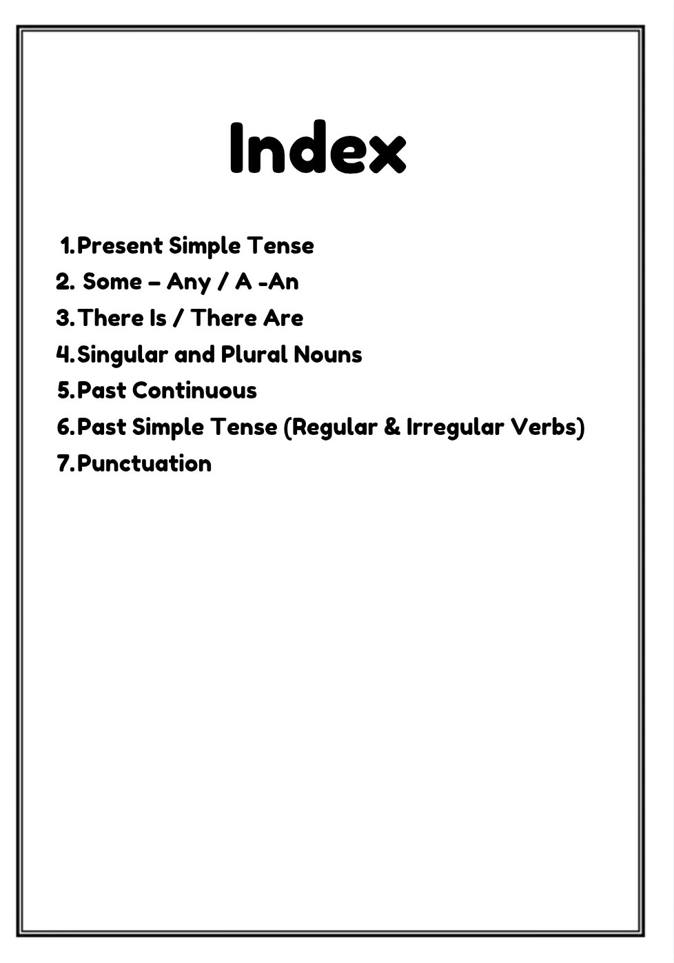 ✔ Present Simple Tense✔ Articles (A – An) and (Some – Any)✔ There Is / There Are✔ Singular & Plural Nouns (Regular & Irregular)✔ Verb To Be (Present & Past)✔ Past Simple Tense (Regular & Irregular Verbs)✔ Punctuation (Capital letters, full stops, commas, question marks, apostrophes)