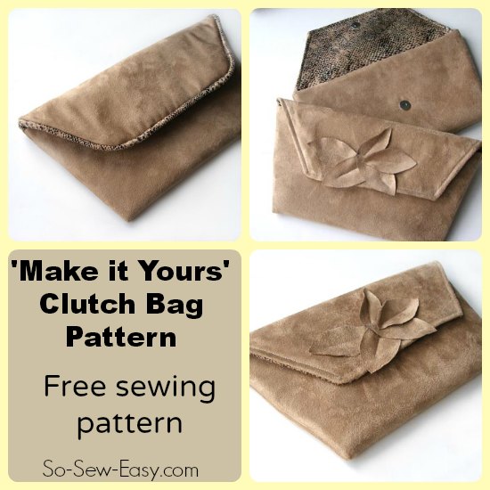 A simple one piece only pattern that folds ingeniously while sewn to create a basic clutch purse. Pattern available in two different sizes. Make the purse plain with some top stitching around the flap, add some piping, add decorations, ribbon, flowers or embroidery to the flap or body of the bag. Add internal pockets or a strap. It's all up to you - make the bag and then customise to 'Make it Yours' with this free clutch bag pattern!