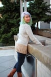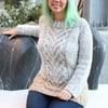Mayu is a top-down, seamless, raglan sleeve construction sweater. The cable down the front, and the color block pattern help to keep your interest while knitting. Best thing is that Mayu knits up super quick in the Paloma Tweed (or any similarly gauged bulky weight yarn), and so the project just flies off your needles!