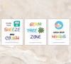 Keep your health office squeaky clean and your people safe with this set of 3 digital printable posters in cheery colors and a bright minimal theme with an easy-to-read white background and kid - friendly font. Signs read "Cover Your Cough or Sneeze", "Wash Your Hands", and "Germ Free Zone" and the words are accompanied by simple graphics. Looks amazing as a set on the wall of any school, health office, bathroom, nurse's station, vaccination van, health clinic, or even home and workplace.