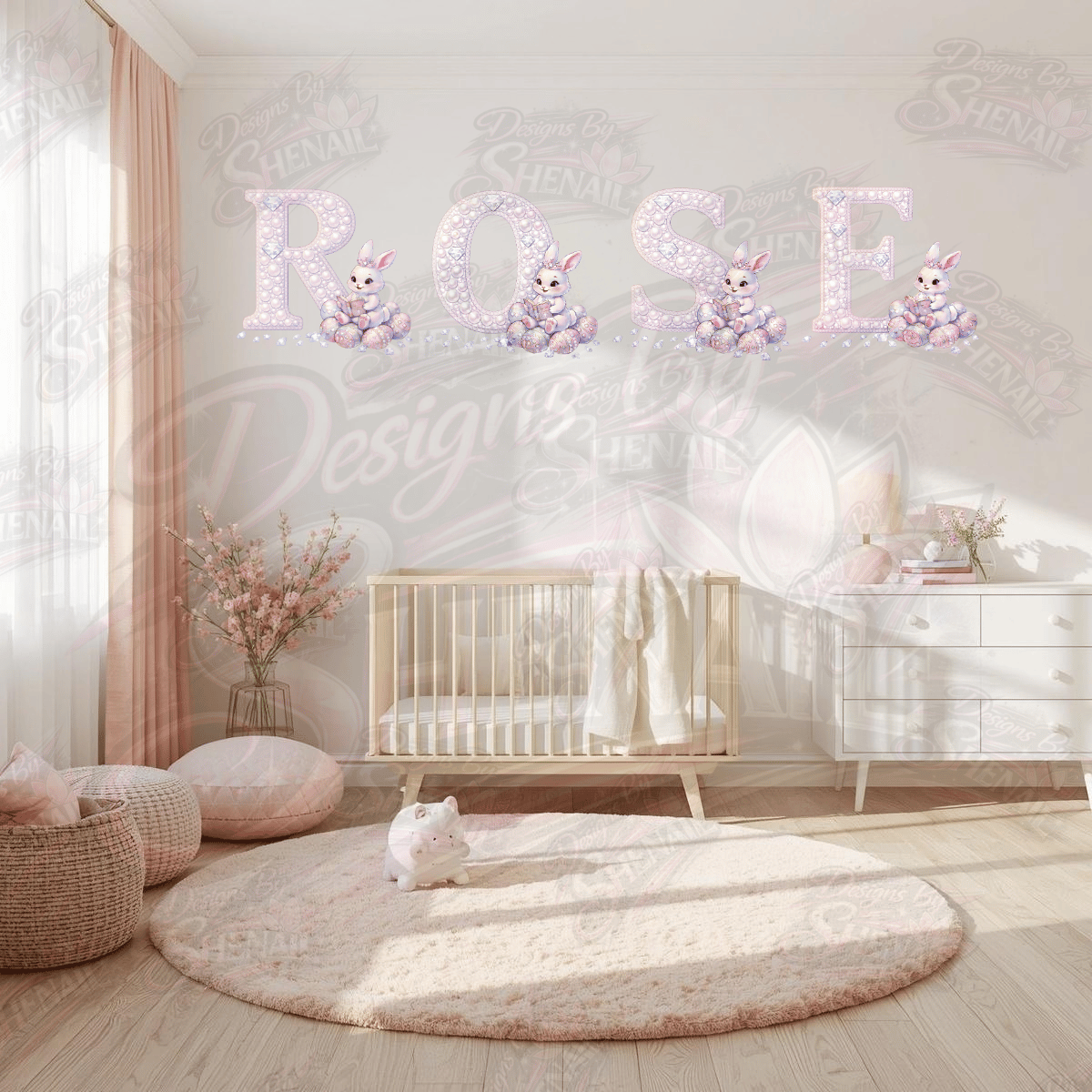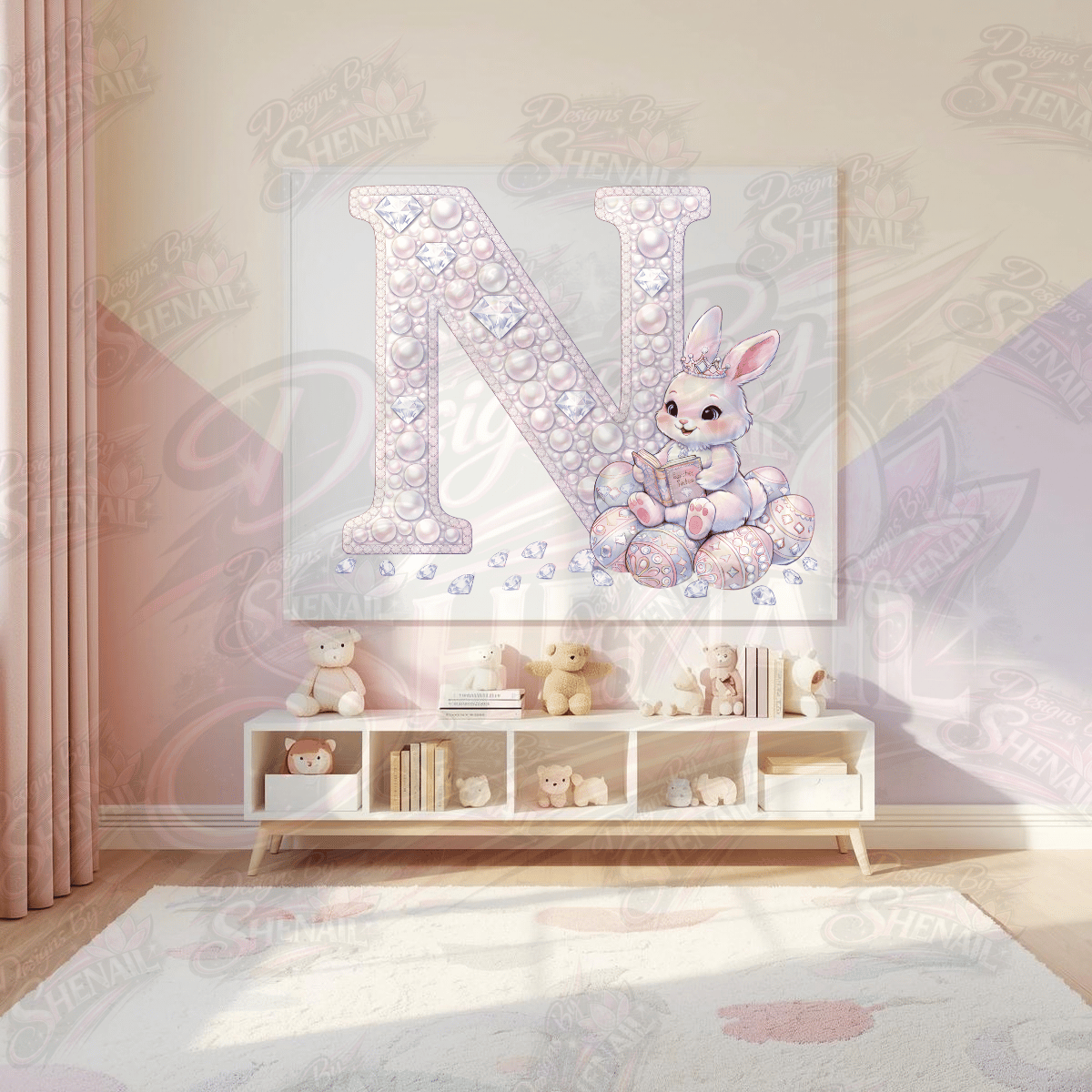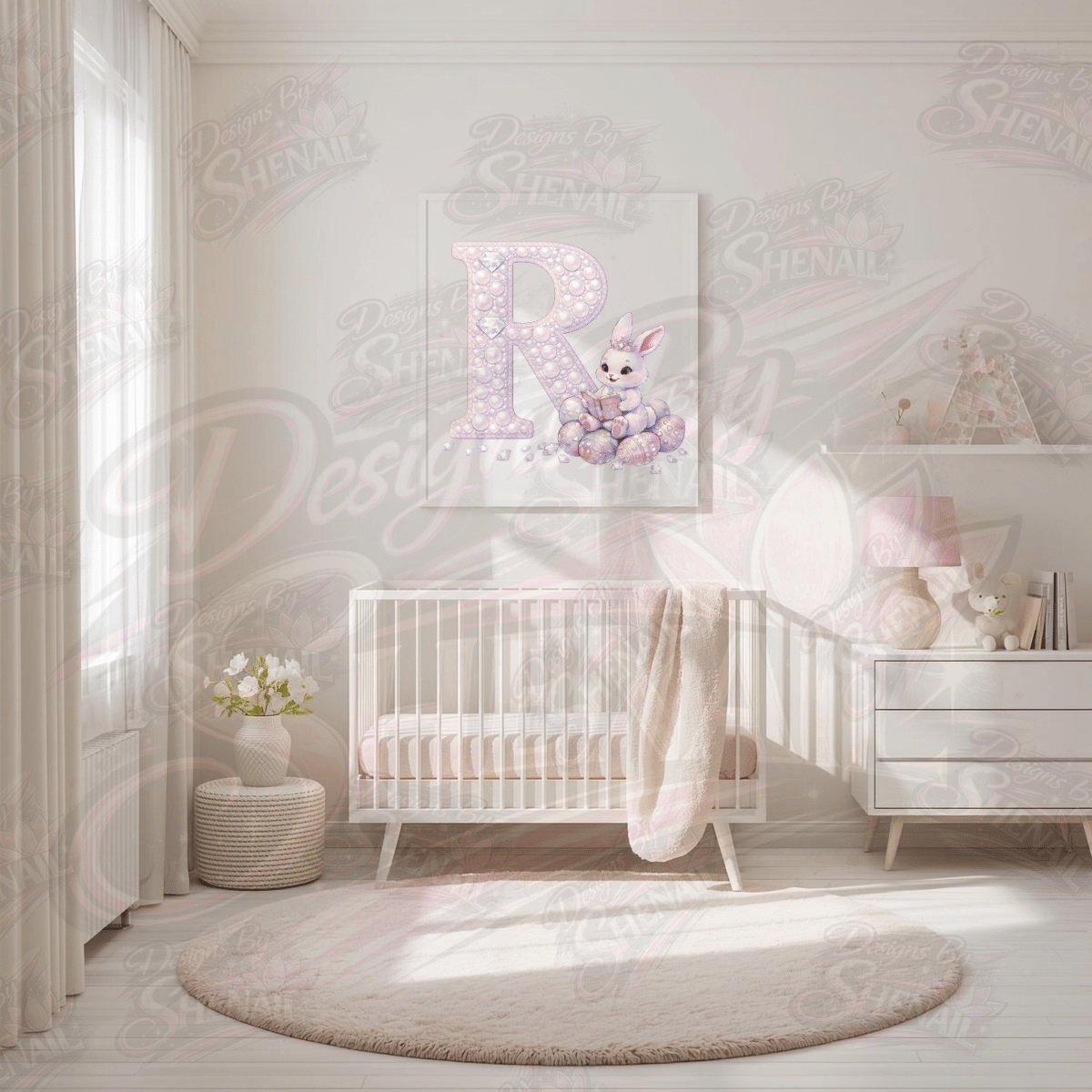 The delicate pearl textures and diamond details give the alphabet a luxury boutique look while the adorable bunny character adds playful Easter charm.
