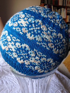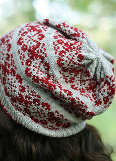 I Dream of Lapland is a fair isle slouchy hat worked in two colors of Backyard Fiberworks Sock. The colors remind me of the quiet, magical place where Husband had wanted to go since he was a kid to meet the real Santa. When we arrived, he went for a walk in the dark and reported a little grocery down the road and a hill for sledding. Later, we went for a nice quiet walk under the stars in -25C air to the “grocery” which turned out to be a Marimekko Store. He has never lived it down and I still dream of that magical place, which turned out to be beautiful and not as cold as one might think but the sauna in our hotel was a mandatory naked one!