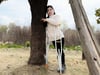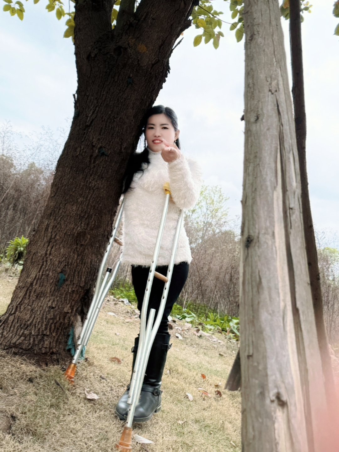 She couldn't stand up on the gentle slope, so she called a friend. With the help of her friend, she managed to stand up and walk up the grassy slope.