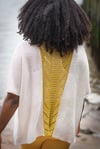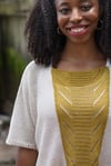 Sun Glow is a light summer tee, designed to be worn with 6-8” of positive ease for a relaxed fit. Modular construction makes this a great travel project. The center lace section can be knit in a contrast color (as shown) or the tee can be knit all in one color.