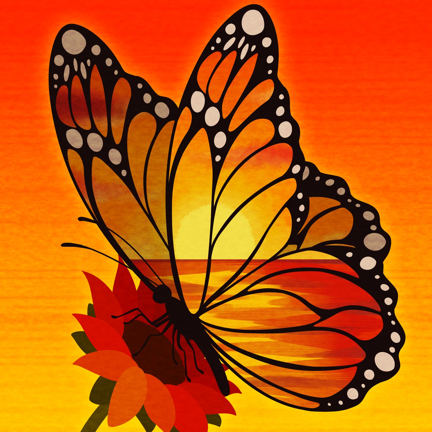 A Monarch’s Sunset draws a quiet parallel between the delicate presence of a monarch butterfly and the fleeting warmth of a setting sun. Bathed in layered shades of orange and gold, the butterfly rests against the glow of dusk, as if it were born from the sky itself. The moment feels brief yet complete, capturing beauty at the edge of departure—when light softens, colors deepen, and everything slows. In blending the monarch’s natural hues with the sunset’s warmth, the artwork becomes a meditation on transience, reminding us that some of the most vivid moments exist only for a short while before fading gently into night.