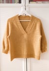 Elegant V-neck sweater with ¾ length sleeves. The sweater is worked seamlessly from top down and requires minimal finishing.