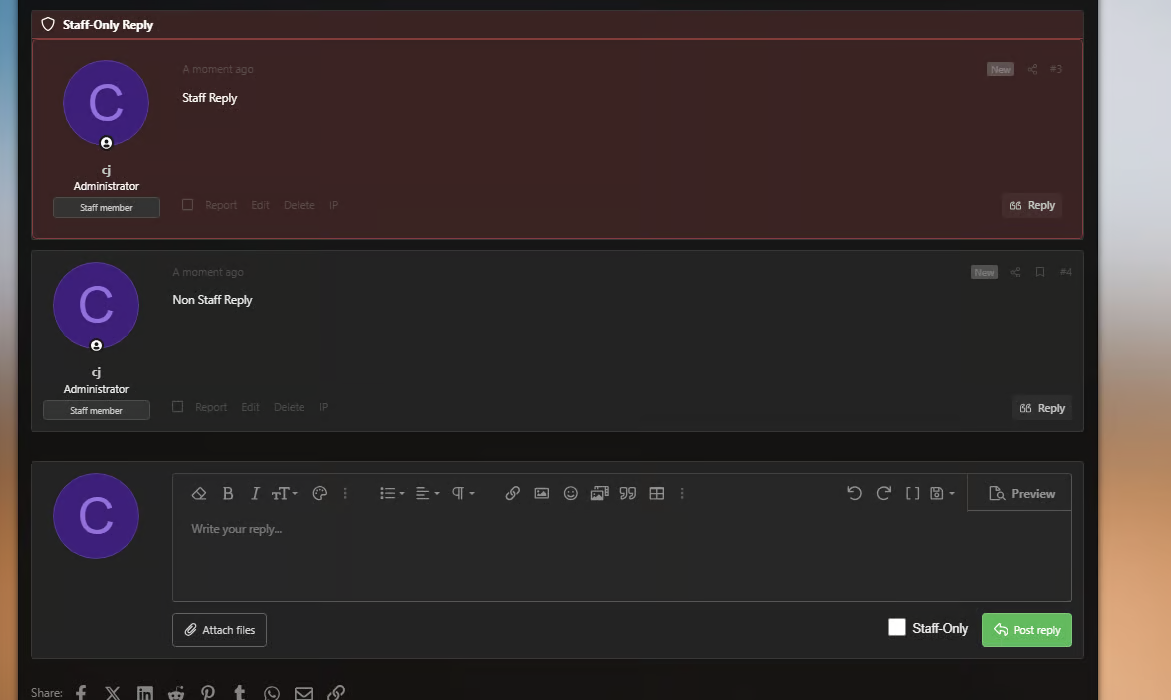 A lightweight XenForo add-on that allows users with the appropriate permissions to post hidden replies. These replies are only visible to other users with the same permissions, making it ideal for internal staff discussions.