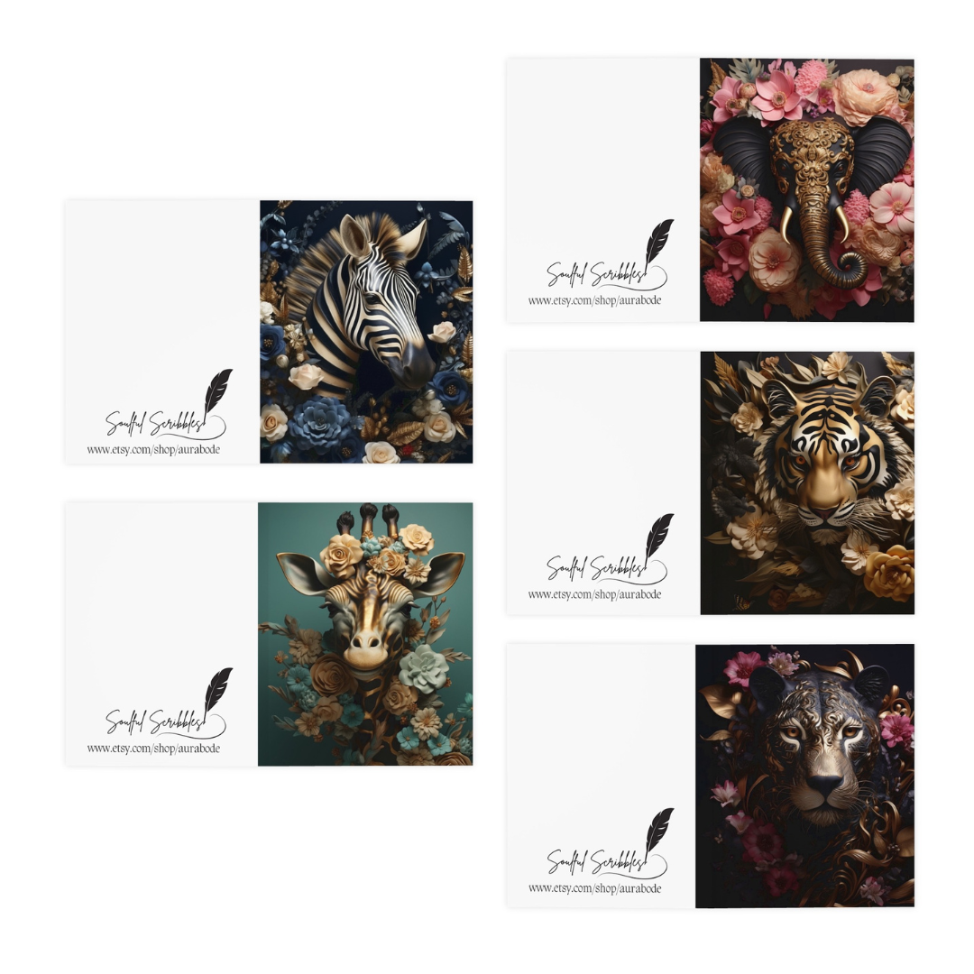 Safari Dreams Greeting Card Set - Set of 5 Cards - Beautiful Animals & Flowers