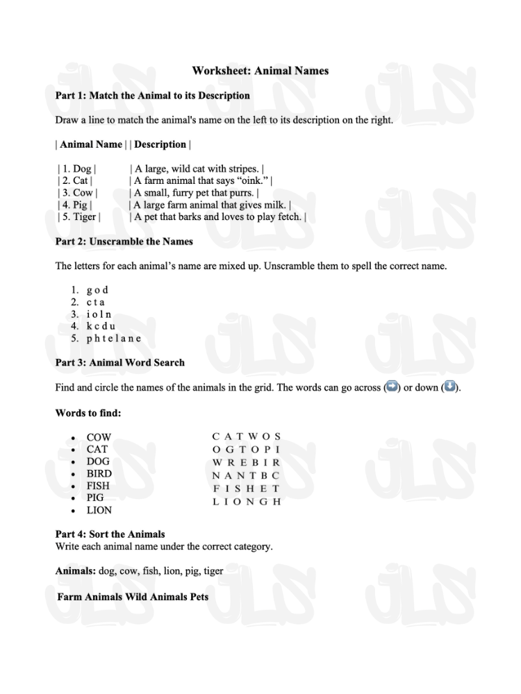 This worksheet is designed to help students learn about animal names and descriptions through a variety of engaging activities. It has a clear purpose: to assess and reinforce students' knowledge of common animals.