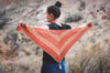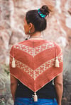 This shawl was designed for the Year 12 (2021-2022) Pro-Verbial Shawl Club from A Verb For Keeping Warm. As we thought of yarn colors for this shawl, I was drawn to the colors of rocks in the washes and trails in the area where I live. Desert colors are always inspirational to me, so I was really pleased with the outcome of these beautiful, naturally dyed yarn colors.