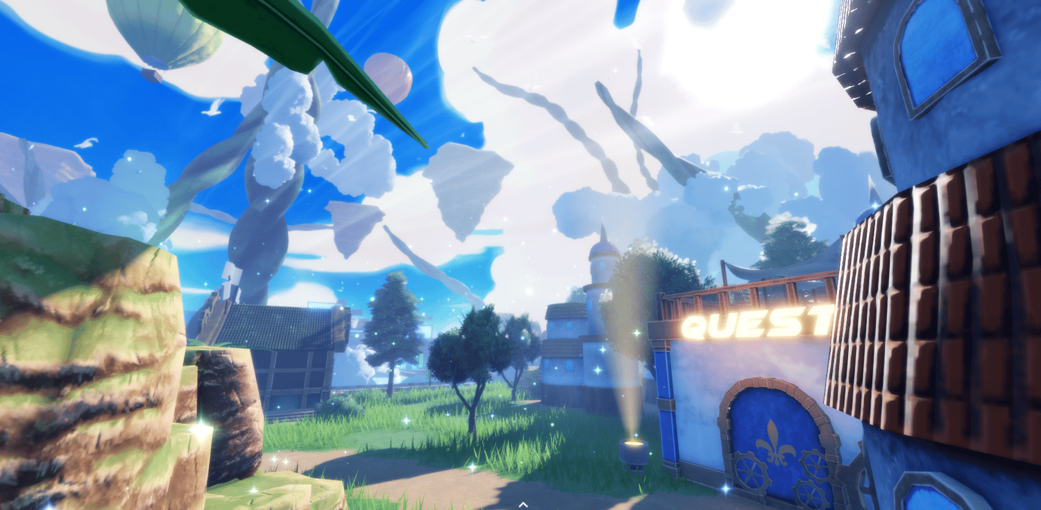 A whimsical sky island racing lobby featuring a complete race track with boost pads, tire barriers, and a stadium start line set among floating islands and towering beanstalks reaching into the clouds. Hot air balloons drift through bright blue skies while fluffy clouds surround lush grassy platforms, rocky cliffs, and charming village buildings. The hub includes dedicated areas for Shop, Quest, and Custom garage with glowing neon signage, plus the iconic Heaven's Gate entrance. Sparkling particle effects and warm sunlight create a magical fairy tale atmosphere. The layout supports smooth racing circuits and social gathering spaces. Perfect for kart racing games, sky island adventures, anime racing experiences, or multiplayer lobby worlds.