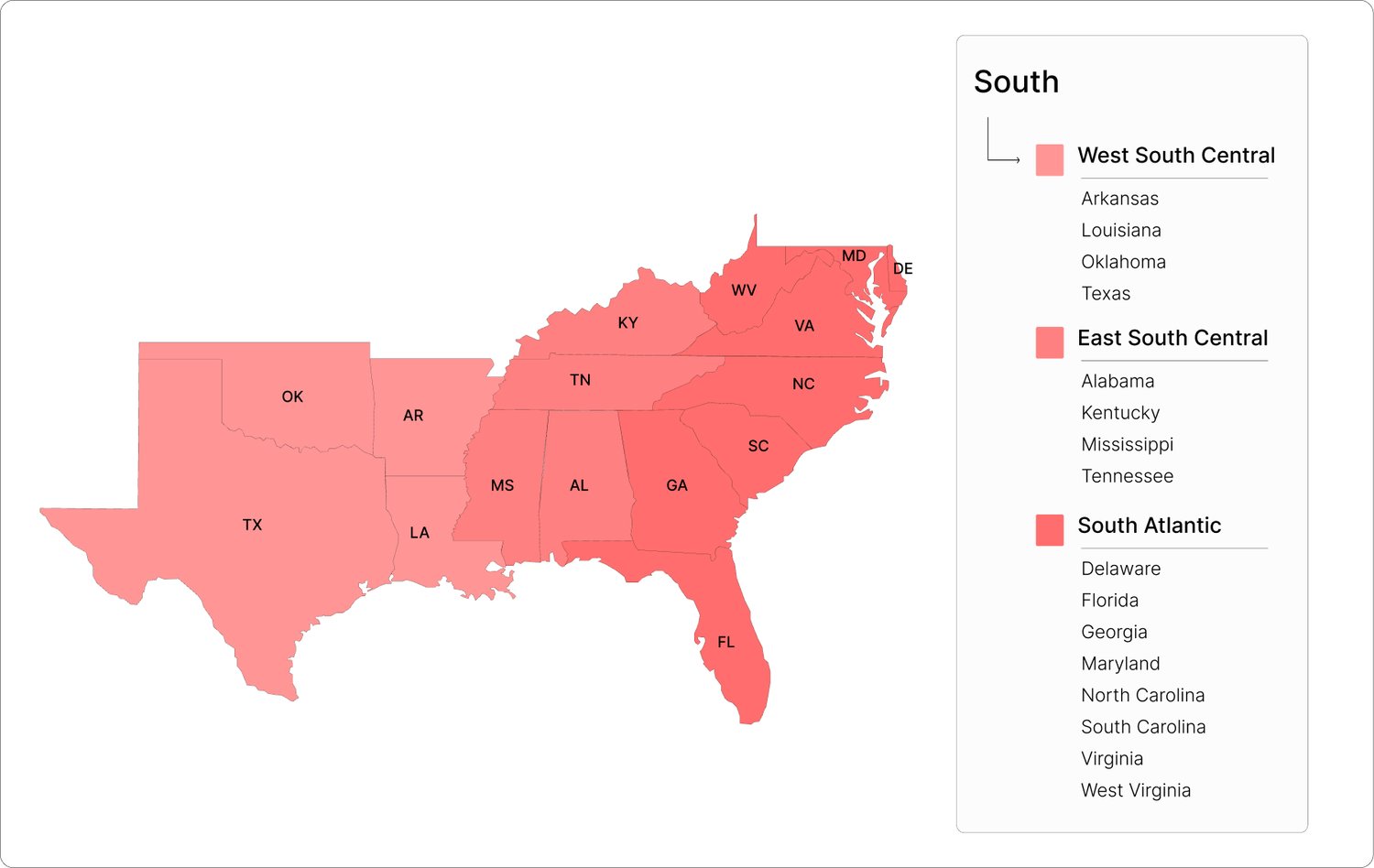 - South Region: Covers South Atlantic, East South Central, and West South Central divisions.