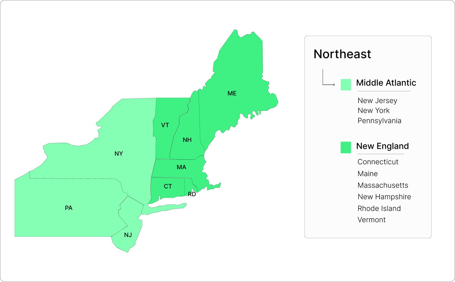 - Northeast Region: Detailed breakdown of New England and Middle Atlantic divisions.