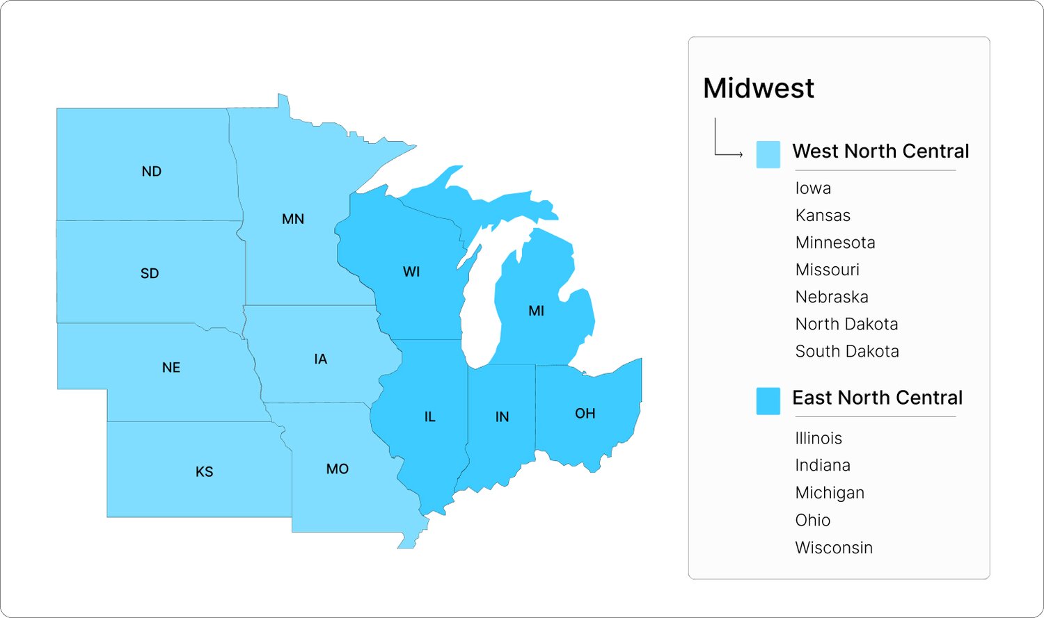 - Midwest Region: Includes the East North Central and West North Central divisions.