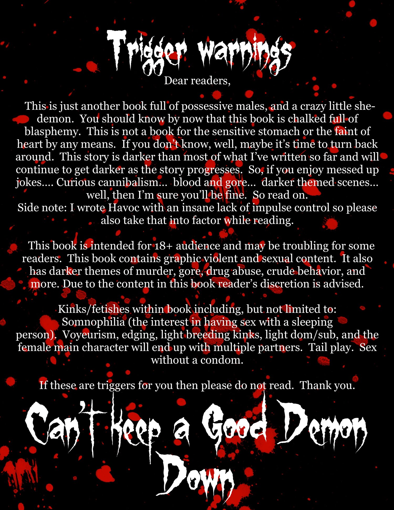 Can't Keep a Good Demon Down is the second book in Havoc's story. Basically it's where things went terribly wrong. For fans of unhinged female main characters, fated mates, anti hero, reverse harem, why choose, morally grey characters, dark humor, and gore.TW and CW within the book. This book is a prequel to Havoc’s story. Even though the story starts off with one love interest this series will grow into multiple love interests for the FMC.