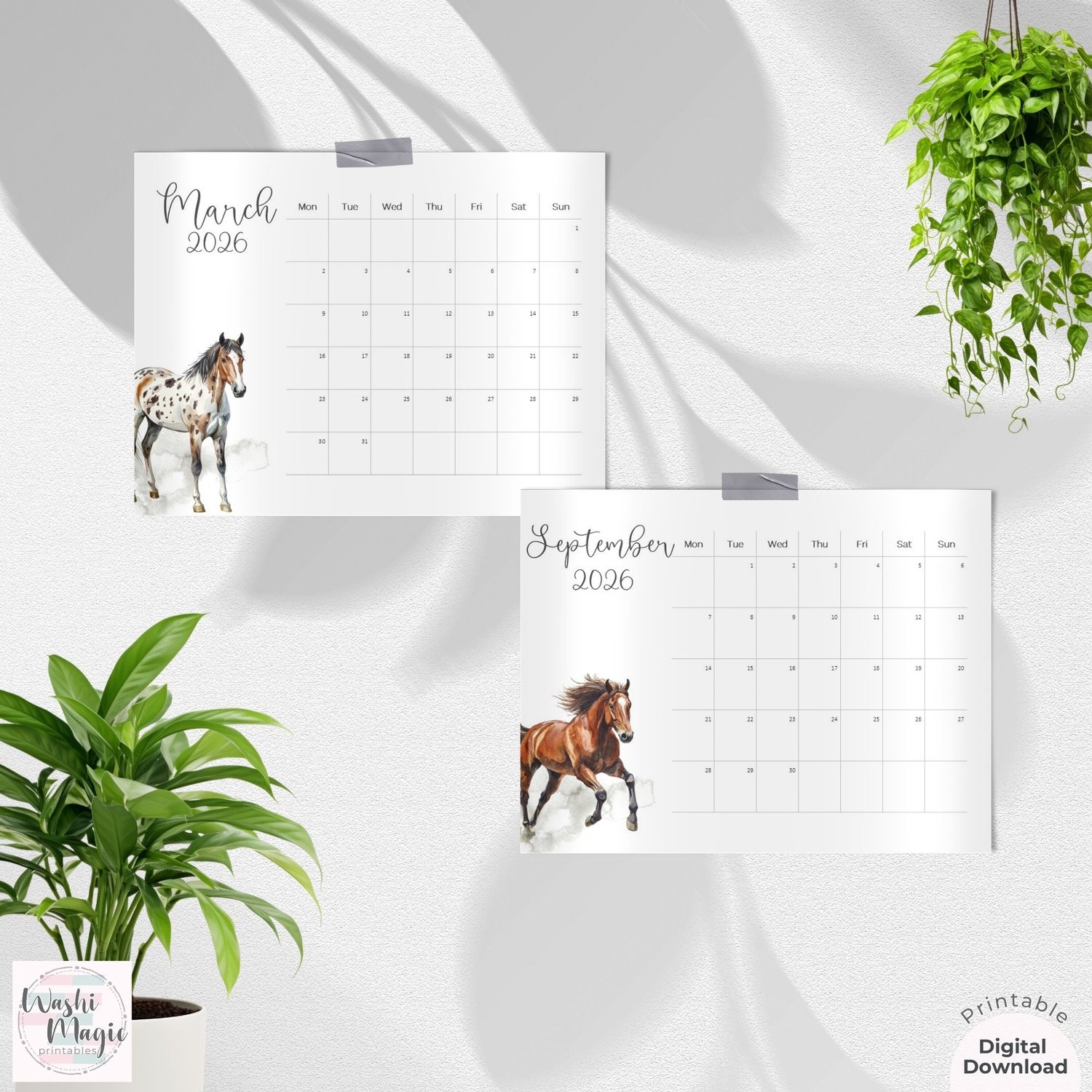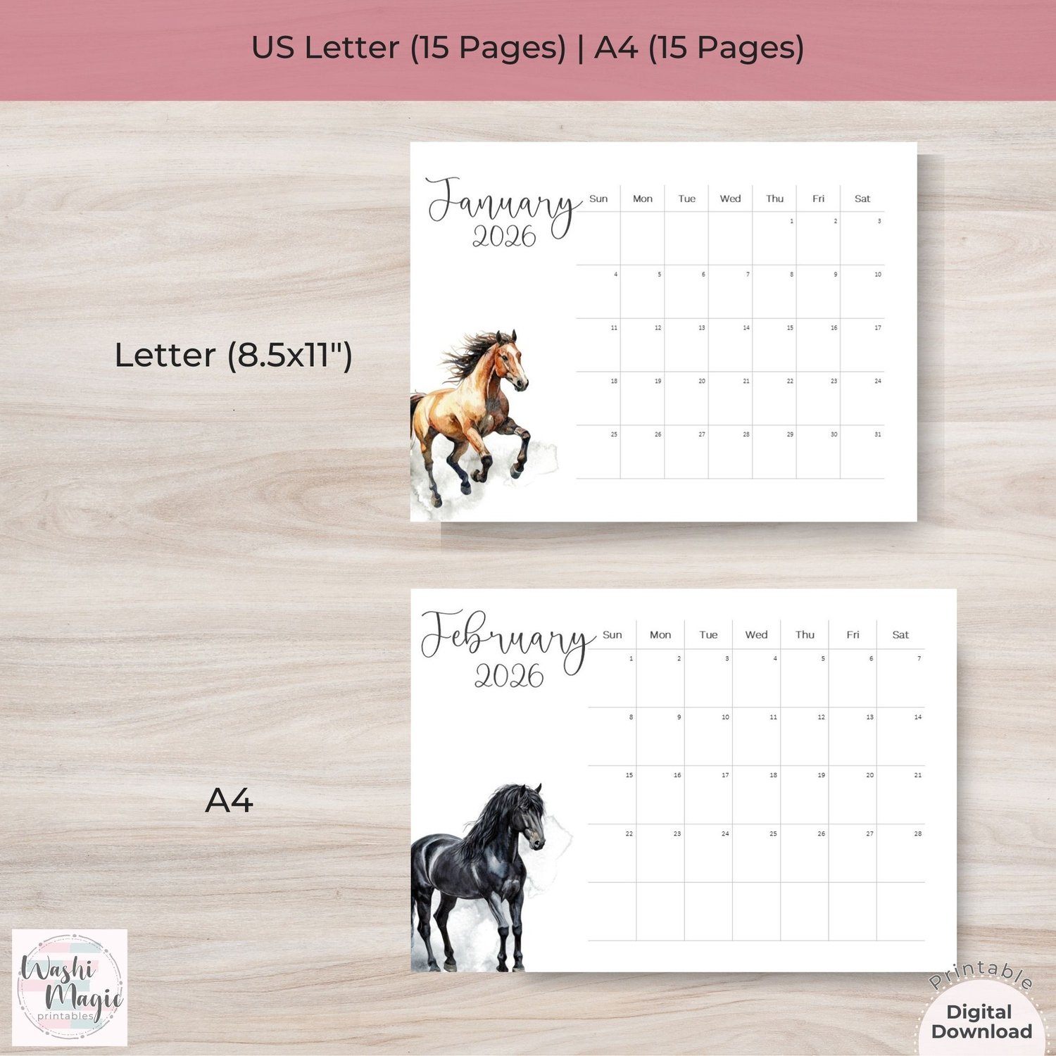 2026 Horse Calendar: Dated Monthly Printable Landscape Horizontal Minimalist Planner