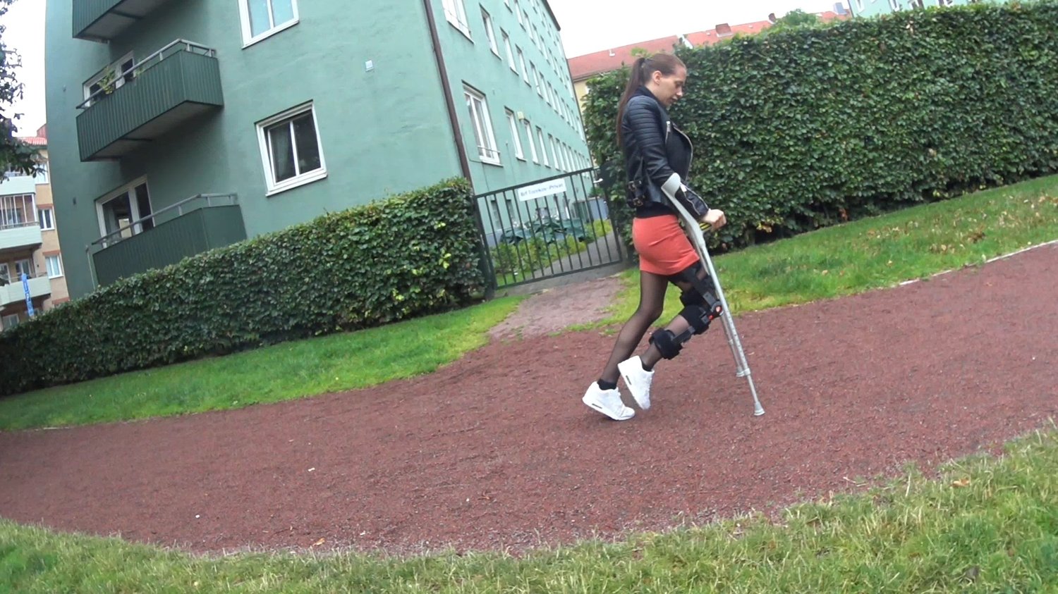 After an accident is Sunshine crutching around with a knnebrace on her right leg.
