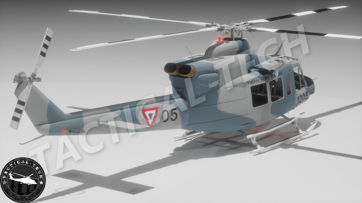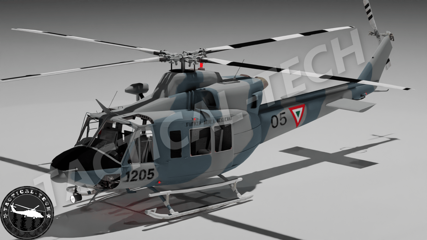 Mexican Air Force Texture: The model's texture simulates the distinctive appearance of a Mexican Air Force helicopter, including the colors, emblems, and markings used by this institution, adding a high degree of realism and authenticity to the model.