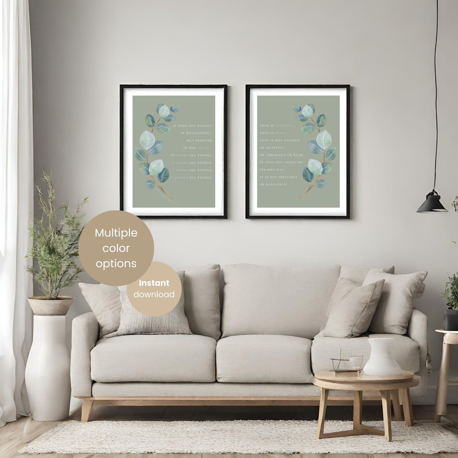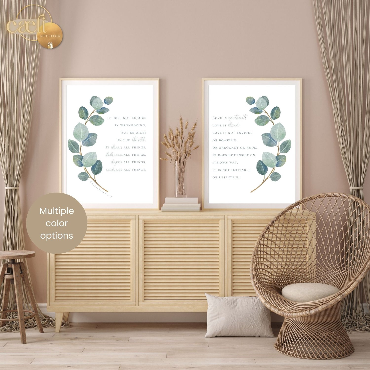 Beautiful 1 Corinthians love-themed biblical scripture wall art perfect for your home. Available in 3 different colors.