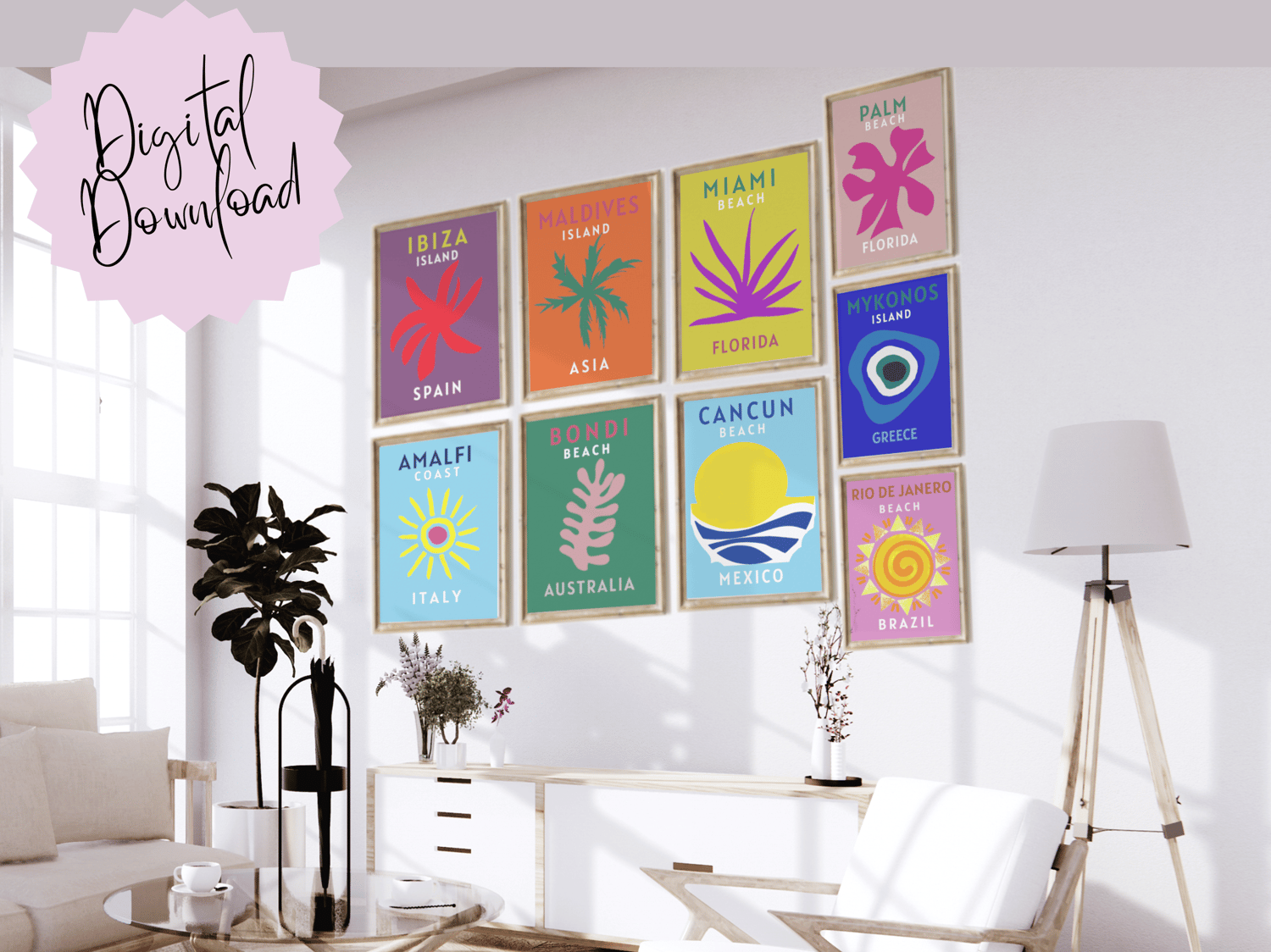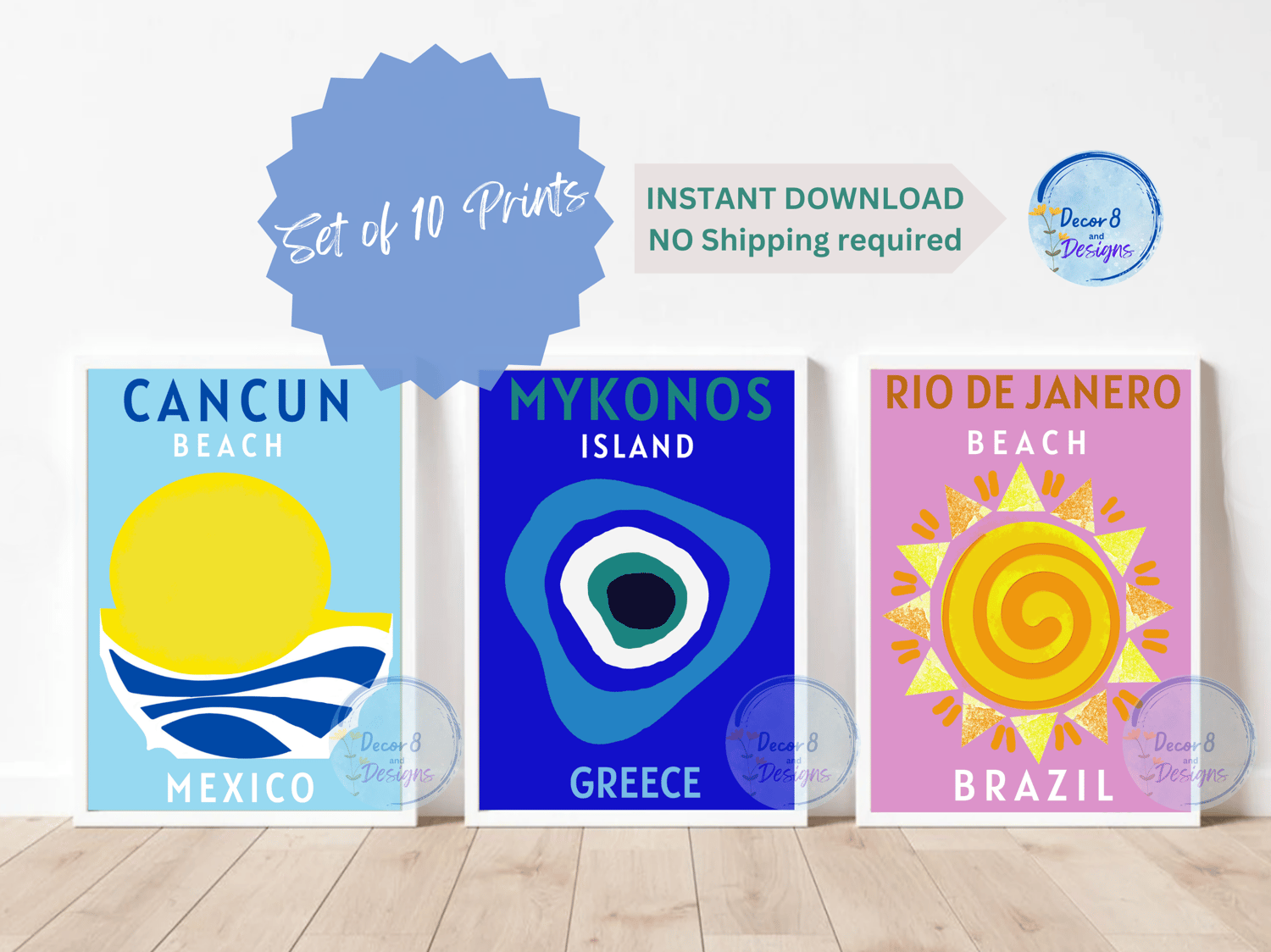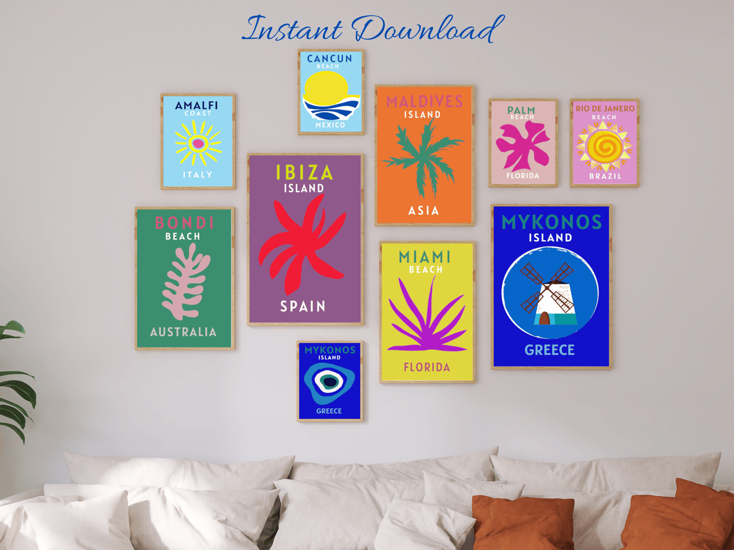 Trendy colorful travel prints of famous places, beaches and tourist hot spots. Perfect for the burst of color on your living room, office, dorm or entrance walls. A set of 10 beautifully styled printable wall decor art works. featuring Amalfi, Mykonos, Ibiza, Miami, Maldives and others. Place in your own frames for display, give them as a gift to someone special, they'll love them!