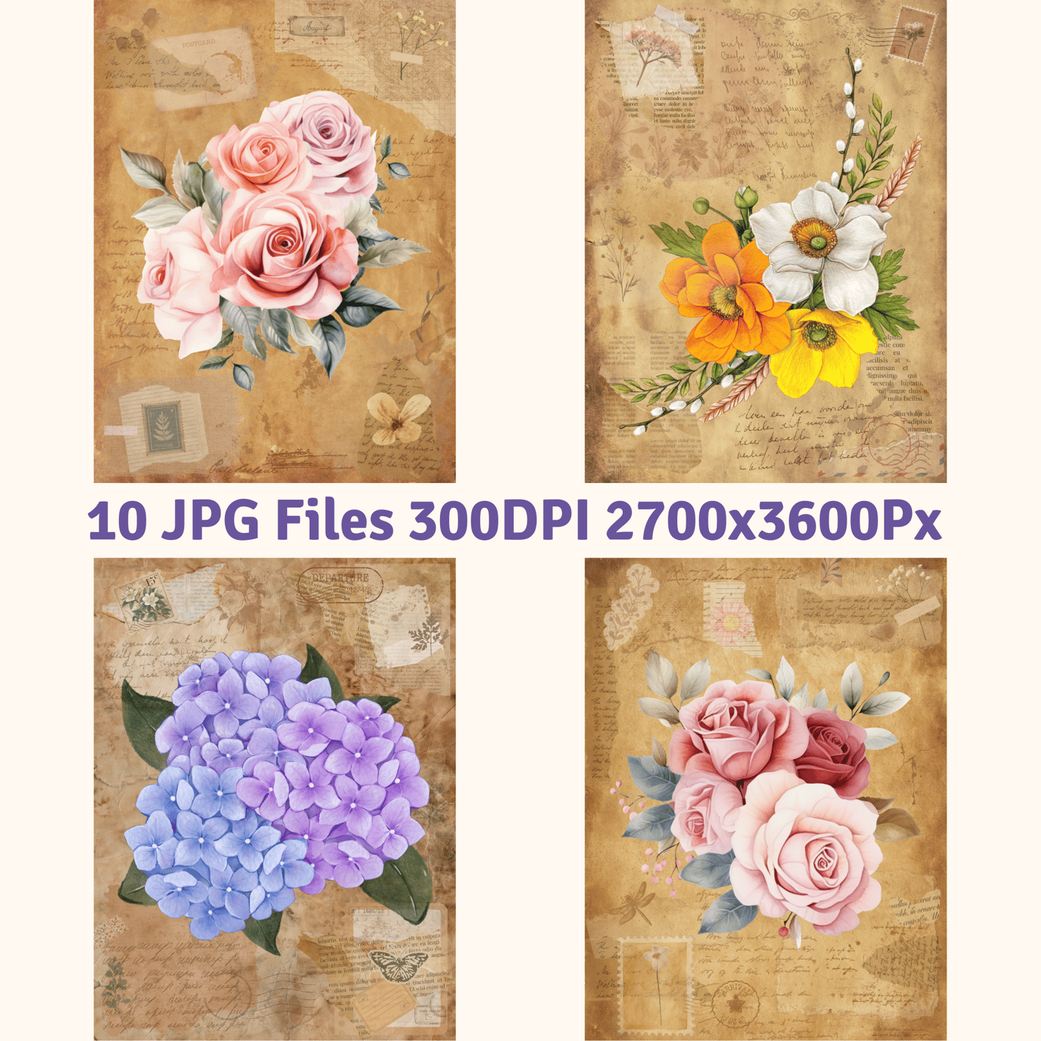 This charming bundle of vintage flower bouquet illustrations is perfect for adding a soft, botanical elegance to your projects. Each image highlights a single, beautifully arranged floral bouquet set against textured vintage backgrounds with antique collage elements, ephemera, and torn paper accents.