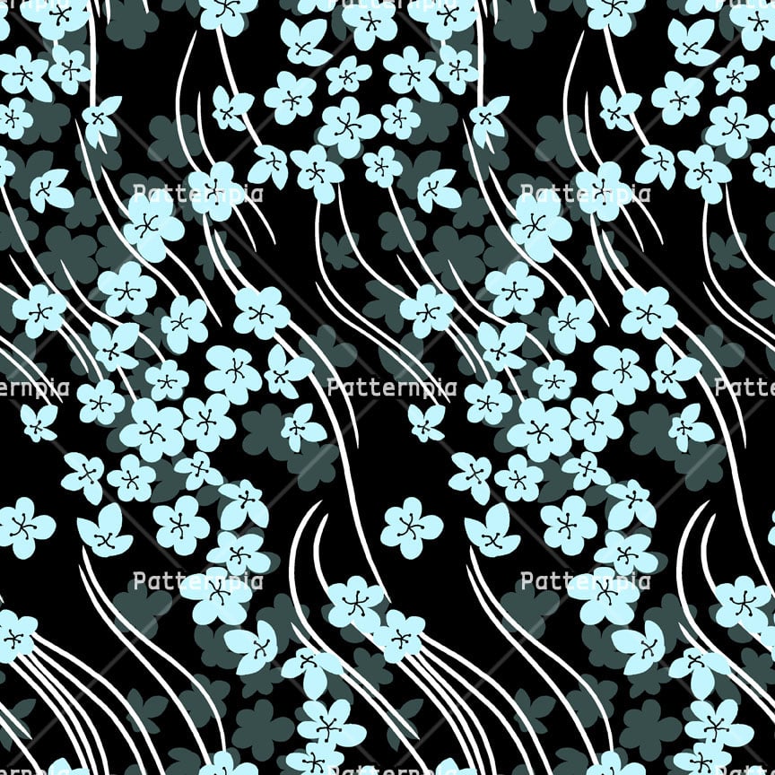 Ethereal light blue cherry blossoms drifting on fluid white waves over a black ground.