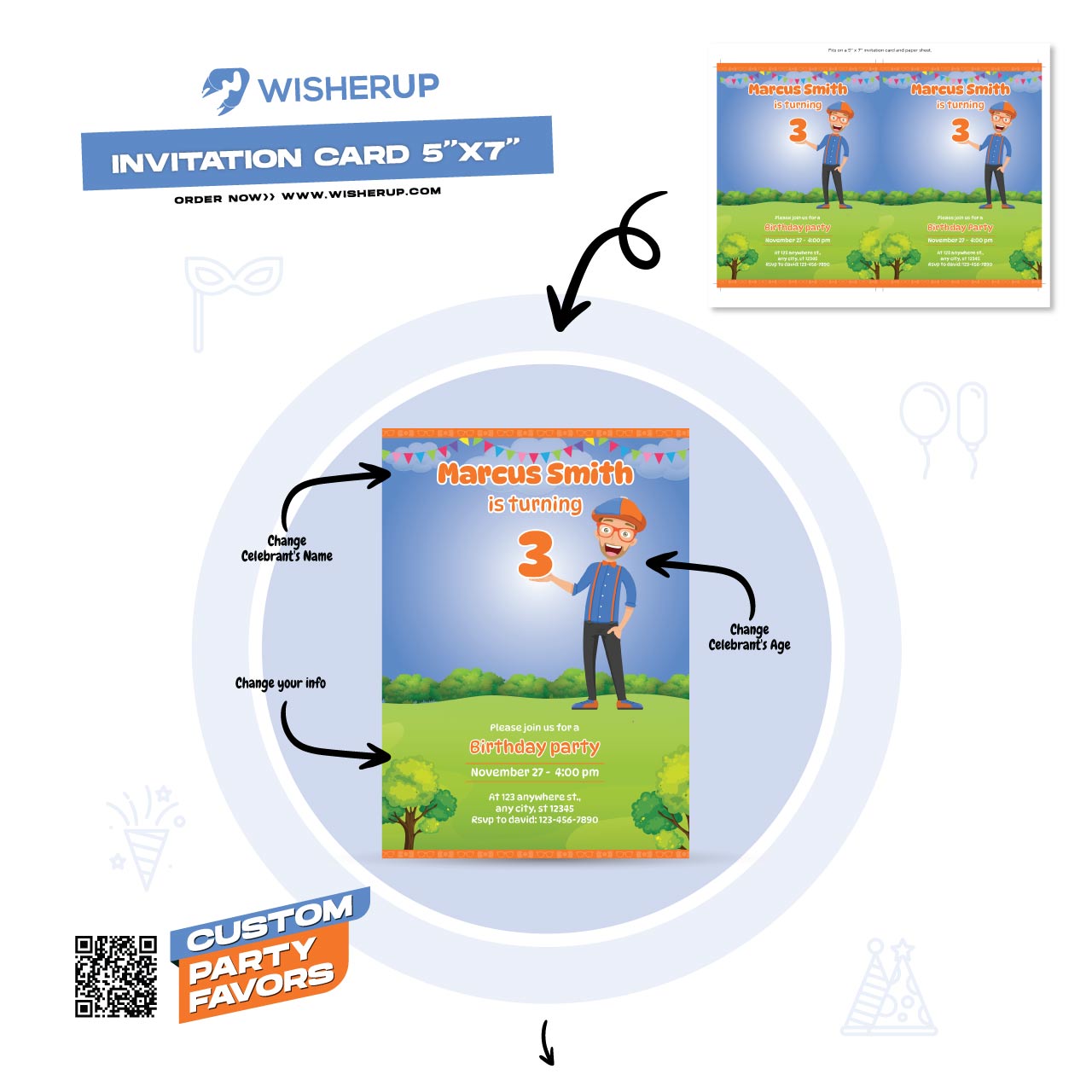 This bundle includes everything you need for a seamlessly coordinated party experience—from invitations and thank-you cards to treat bag tags, each customizable to match your party theme perfectly. Enjoy the convenience of downloading, personalizing, and printing everything from home, making party prep both fun and effortless. Ideal for a party full of laughter, excitement, and shared memories, this Blippi bundle is sure to be a hit with both kids and parents.