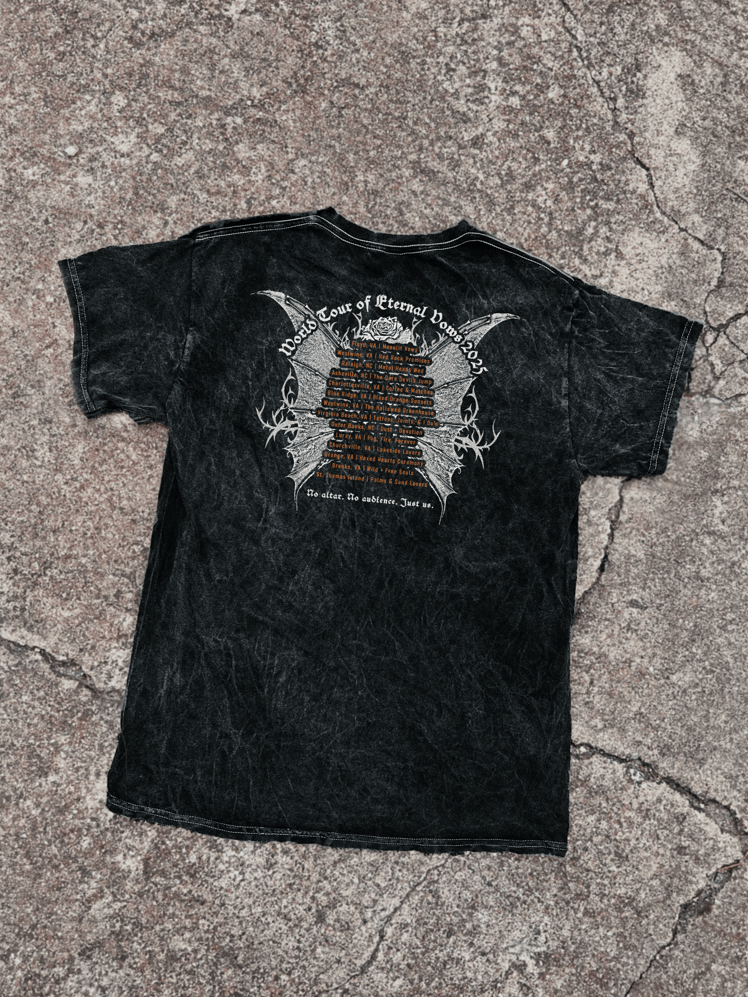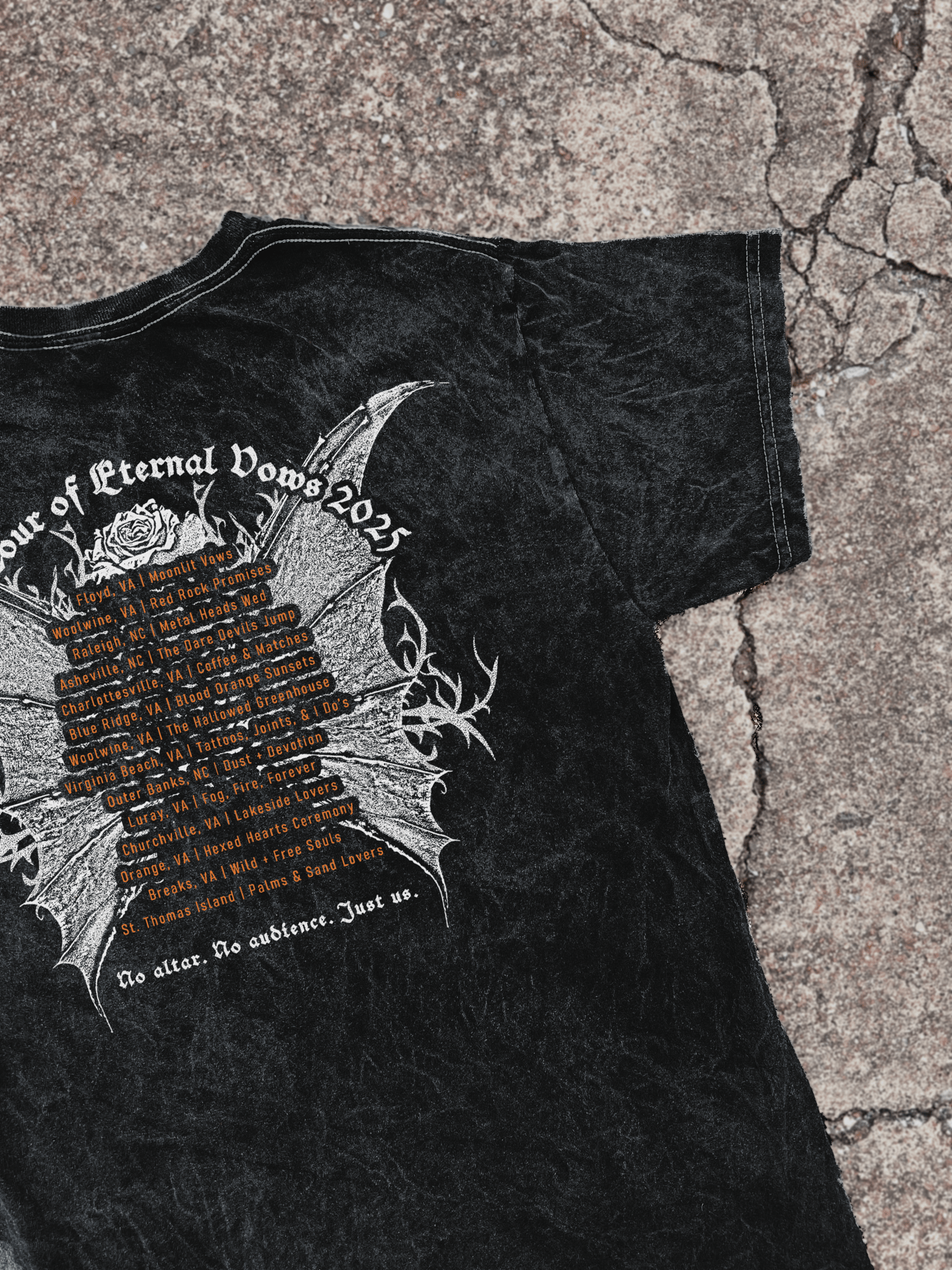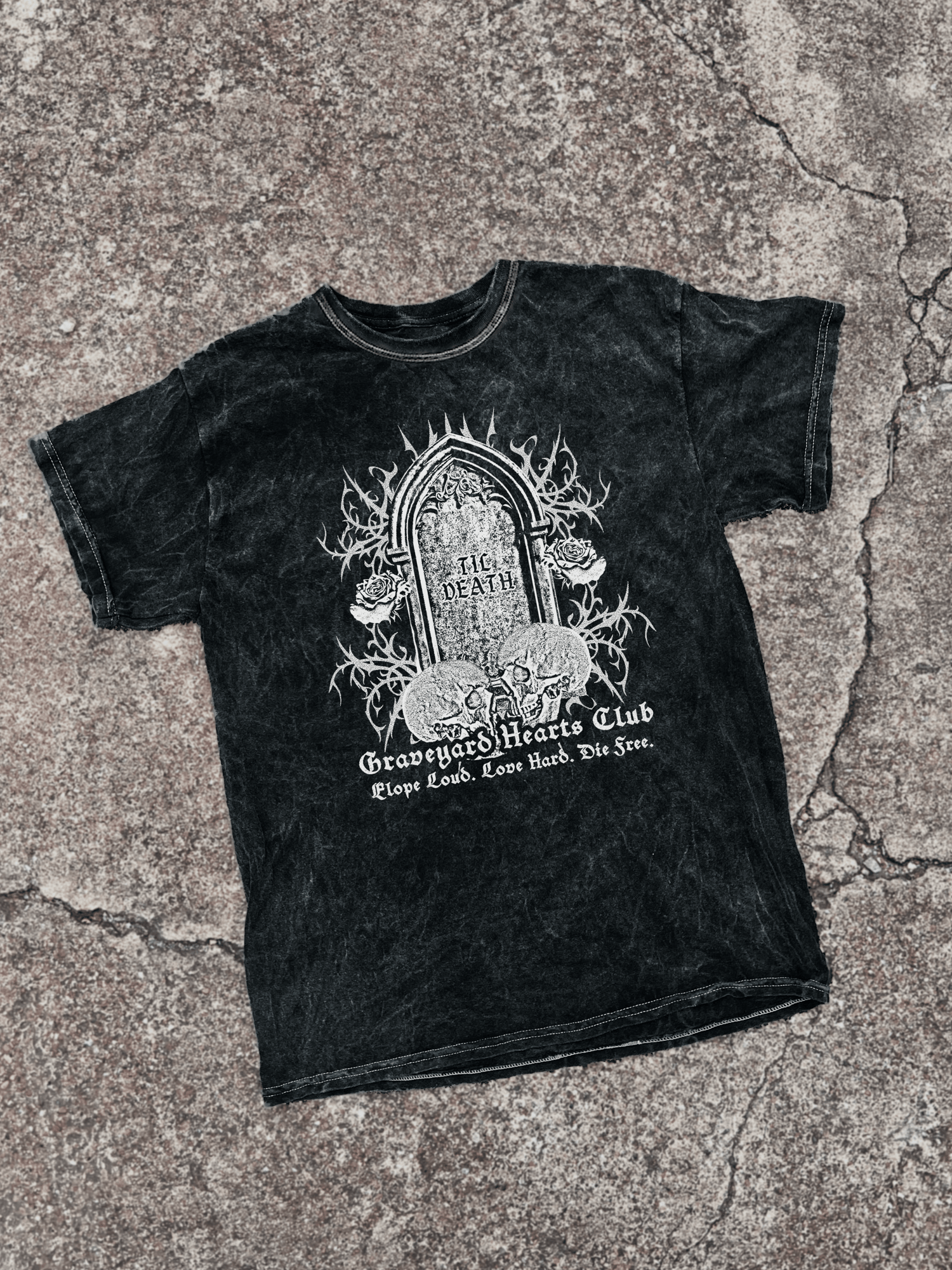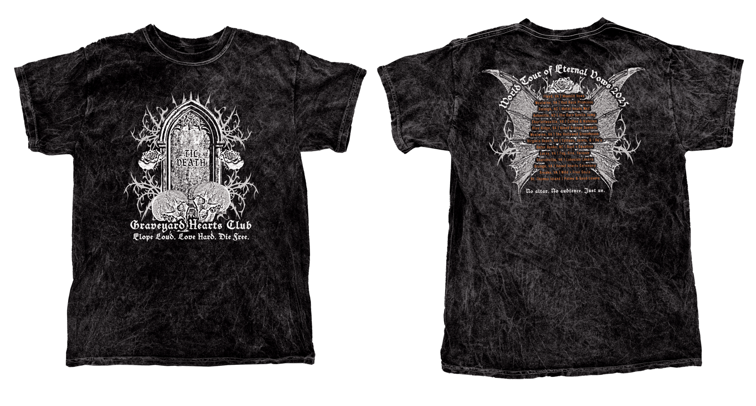 Featuring the official Graveyard Hearts Club insignia on the front and the World Tour of Eternal Vows (real elopements) on the back, this limited-edition acid-washed shirt is a wearable vow.