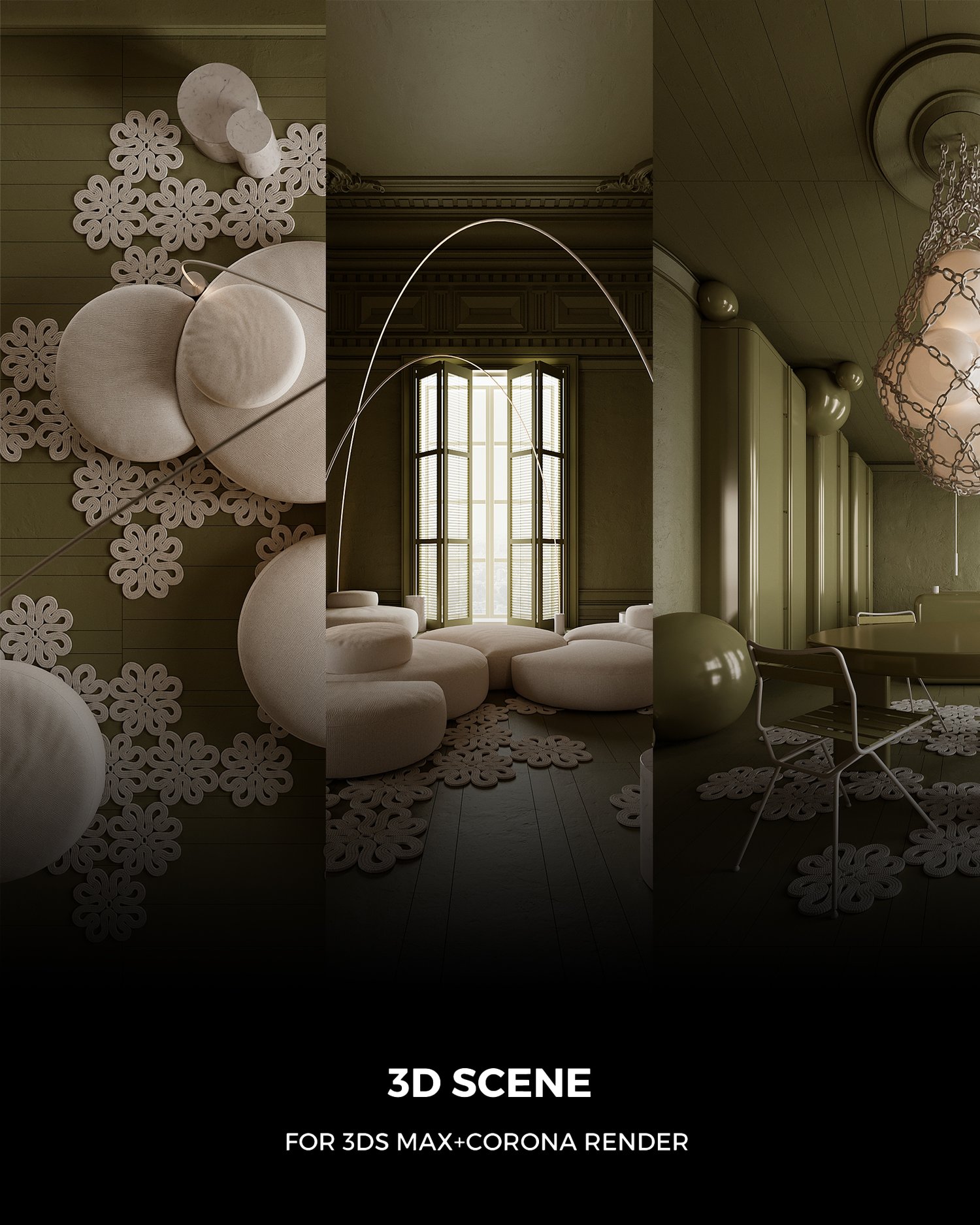 3D scene made in 3Ds Max + Corona Render, with customized lighting and materials. The scene is worked out and assembled with incredible detail, clarity and accuracy. Saved all lighting settings, textures, furniture details. This is an incredibly useful tool for designers and visualizers who want to improve their skills and level up their work in 3Ds Max 2018-2024 + Corona Render 8. Enjoy!