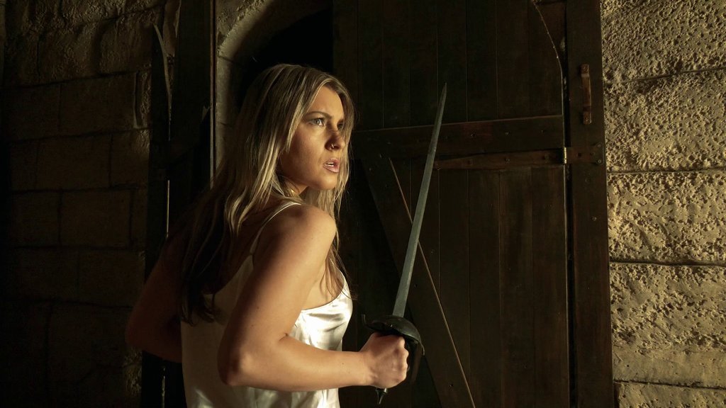 She takes her sword to investigate. She discovers an open side door in her palace.