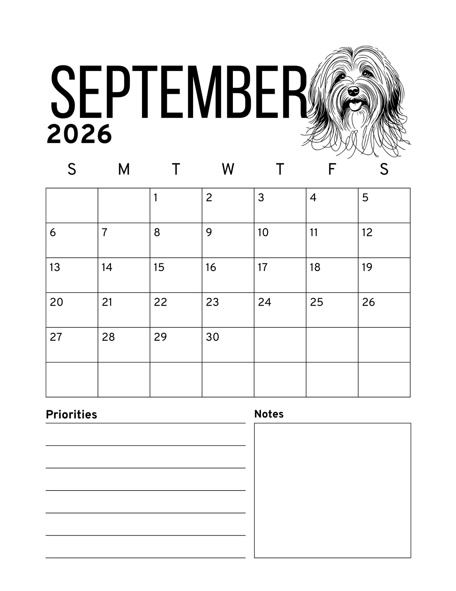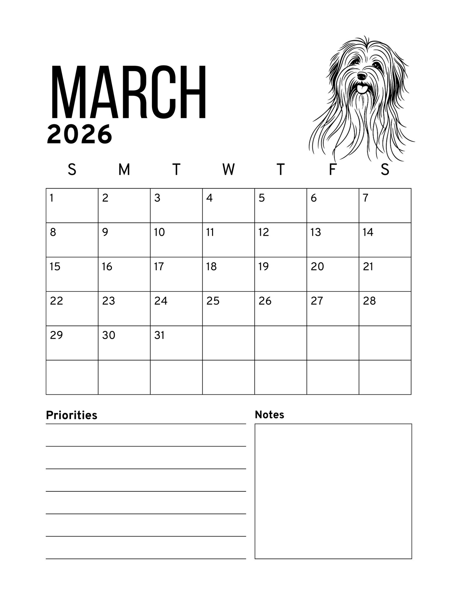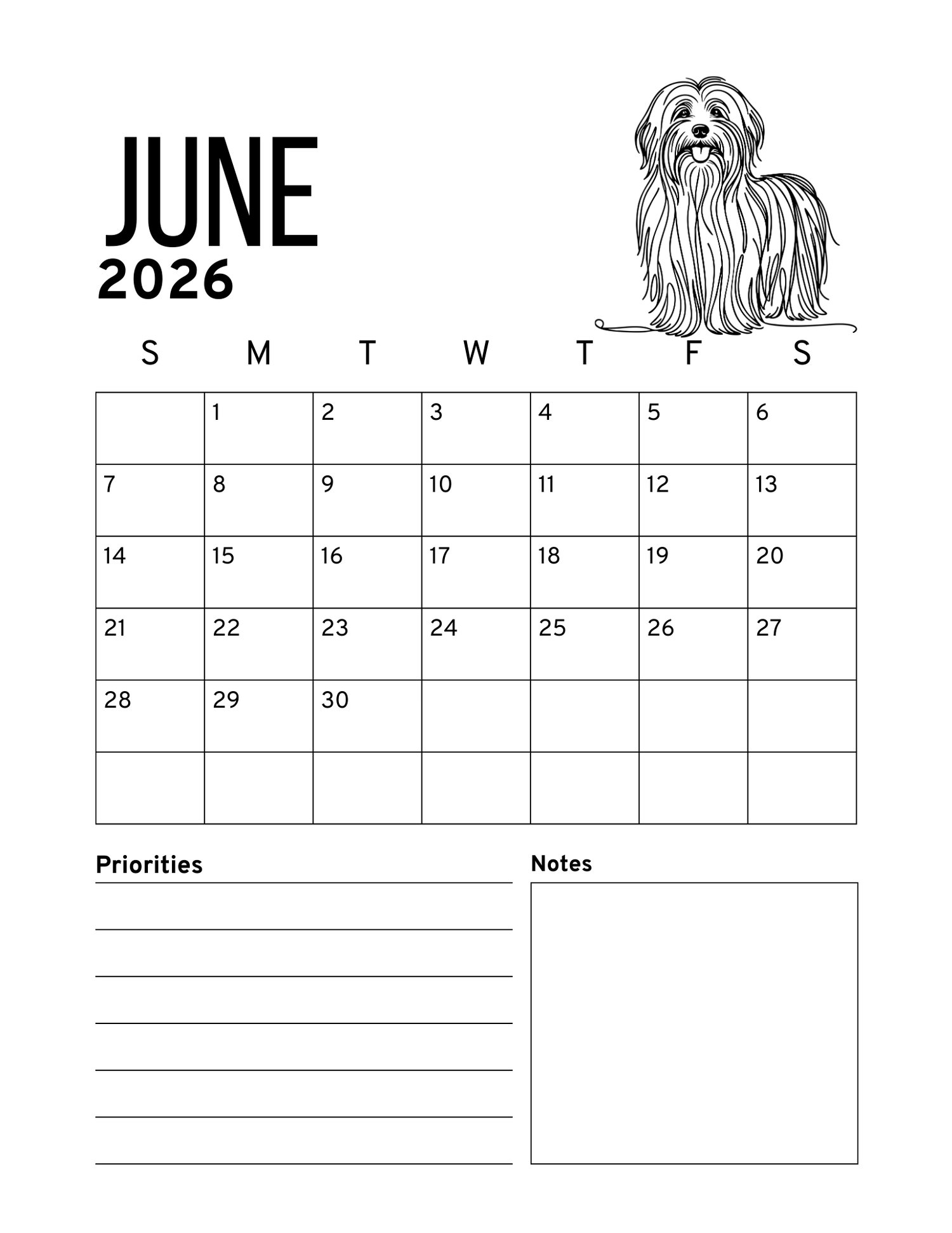 Start the new year with the grace, beauty, and personality of the Havanese! This 2026 printable calendar brings the beloved Havanese breed to life month after month. Enjoy stunning Havanese-themed artwork throughout the year, or gift it to a friend who adores this loyal and elegant breed. Simply download, print, and enjoy a full year of Havanese joy.