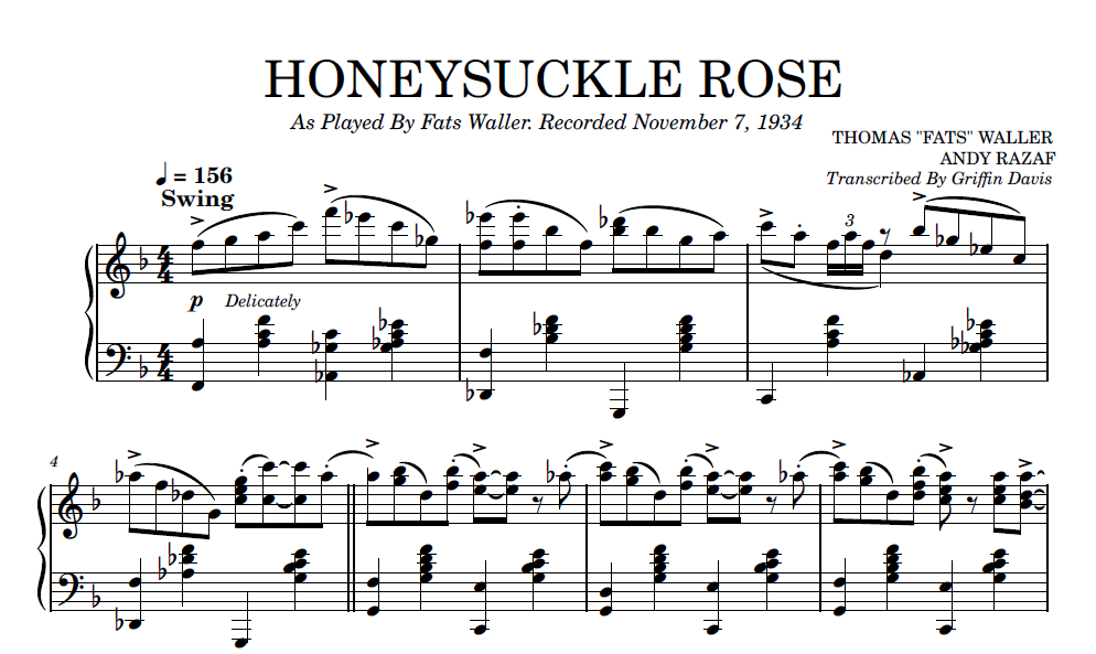 Transcription of Fats Waller's 1934 solo on Honeysuckle Rose. This score includes other sections adapted from the parts of the rest of the song.