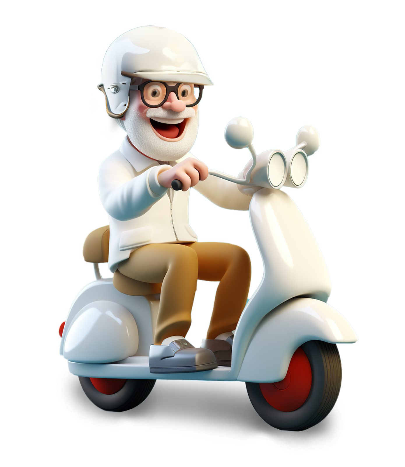 Discover the 3D cartoon-style clipart portraying a retired man happily riding a white scooter. Adorned with a helmet and a joyful expression, the illustration embodies the concept of active retirement and fuel-efficient transportation. The dynamic depiction captures the essence of a carefree and environmentally conscious lifestyle.