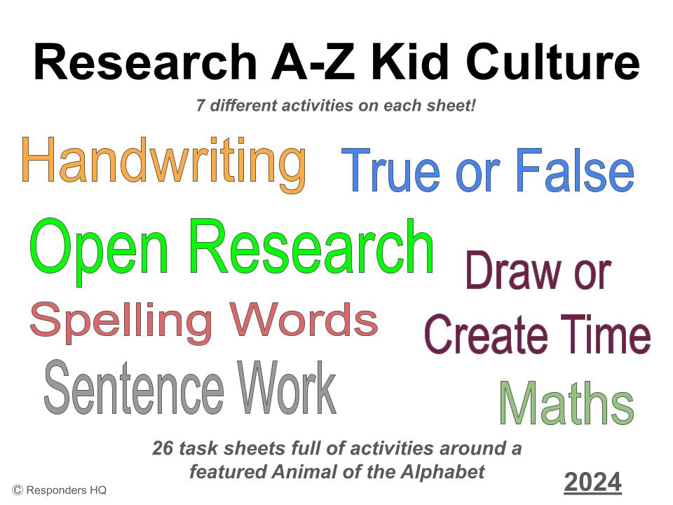 Hot on the success of our 2022 and 2023 editions of the Research A to Z sheets, plus the Animals A to Z, comes the new A to Z of Kids Culture edition. Suitable for students from Year 3 to 8. There are 7 different activities in each sheet and all the answers are included!