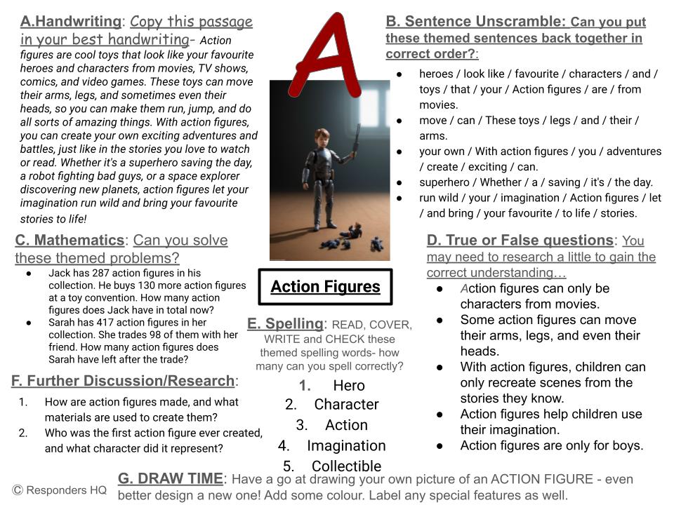 Each sheet has a handwriting copy passage, a sentence unscramble task, mathematics themed problems, true or false questions about the subject, spelling themed words, further questions for research and of course a Draw or Create Task!